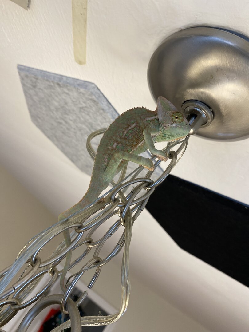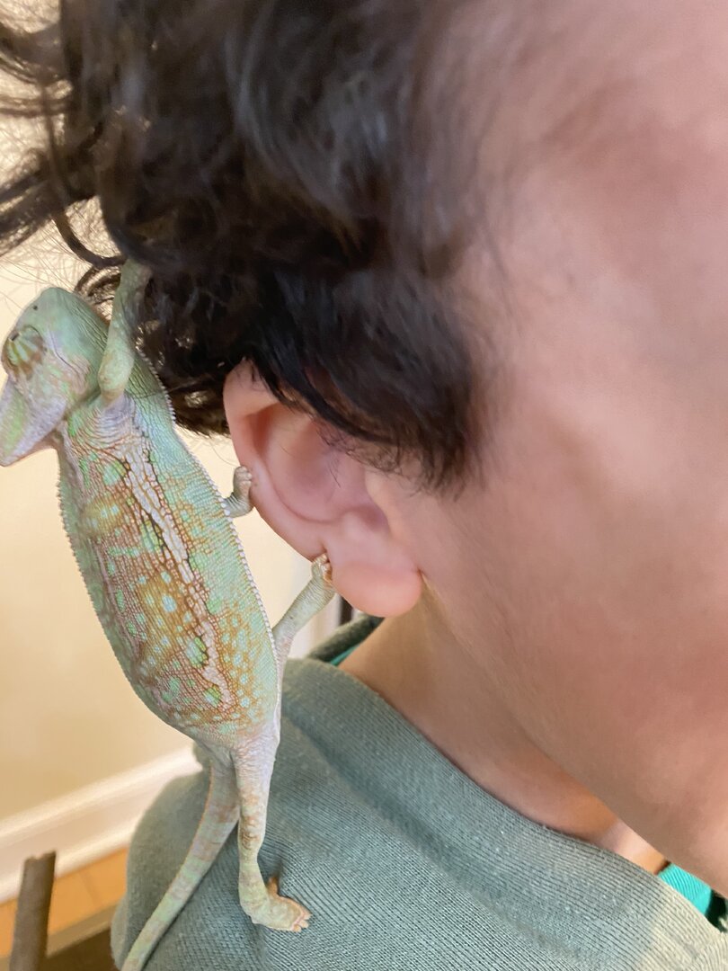 Hello new chameleon owner, how is my chameleon colors? Is he in a good mood or should he be greener, this is about his average color