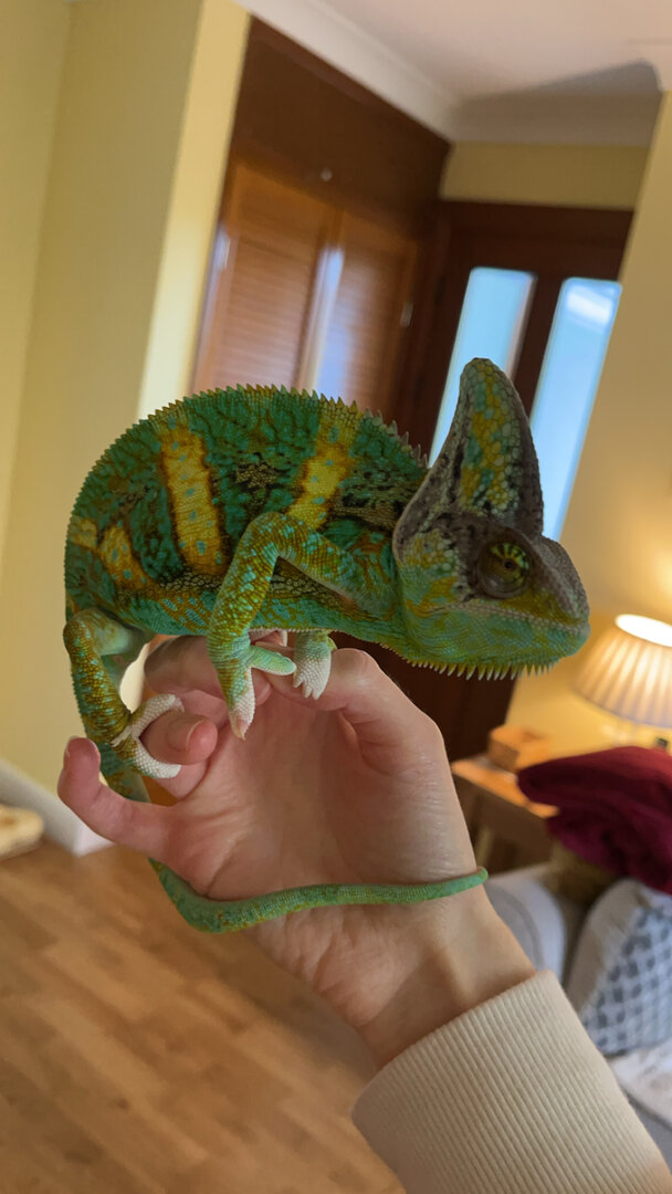 hi!! I have a male veiled chameleon called Papaya, who’s roughly 6 months to a year old. he’s always been incredibly friendly as far as chams go, he’s not scared by me at all and will often climb onto my arm while I’m cleaning his cage.