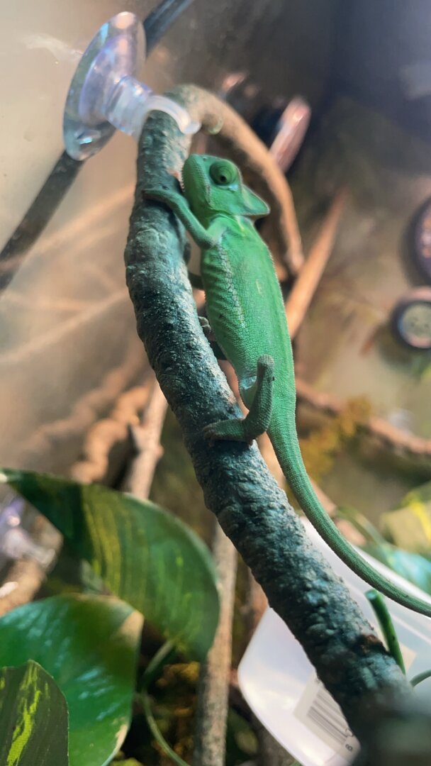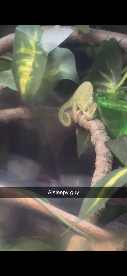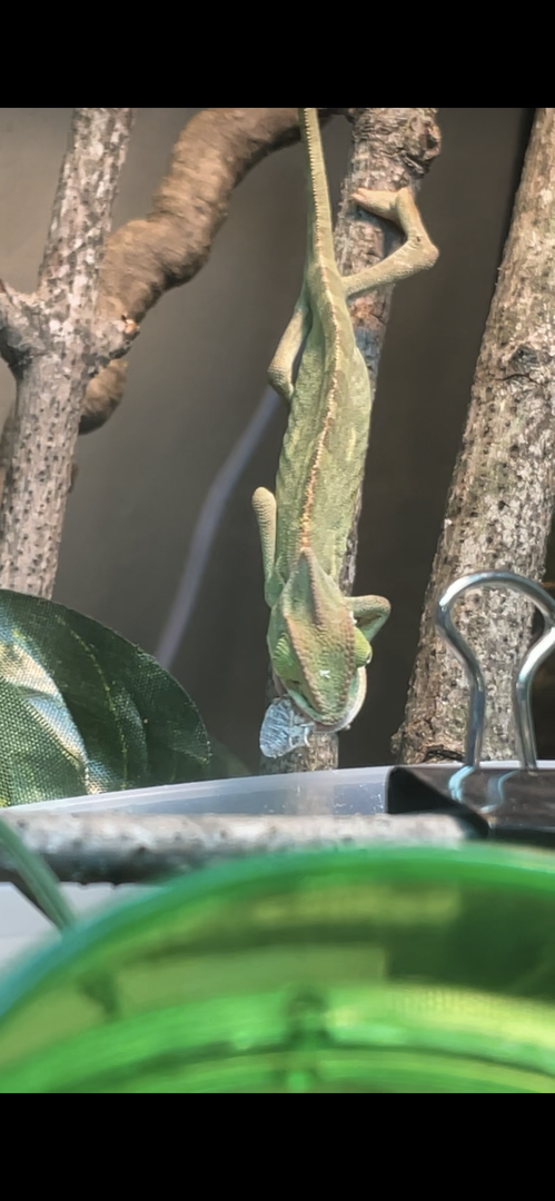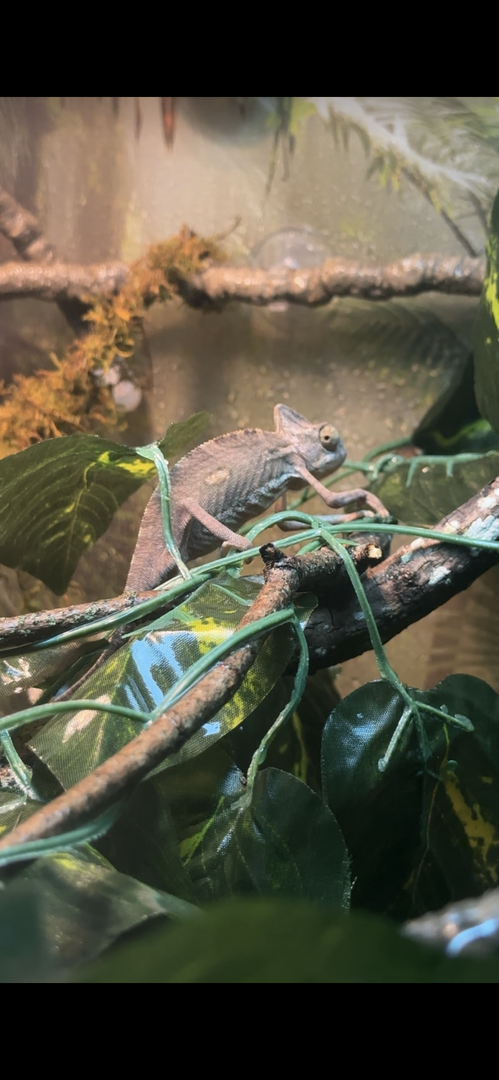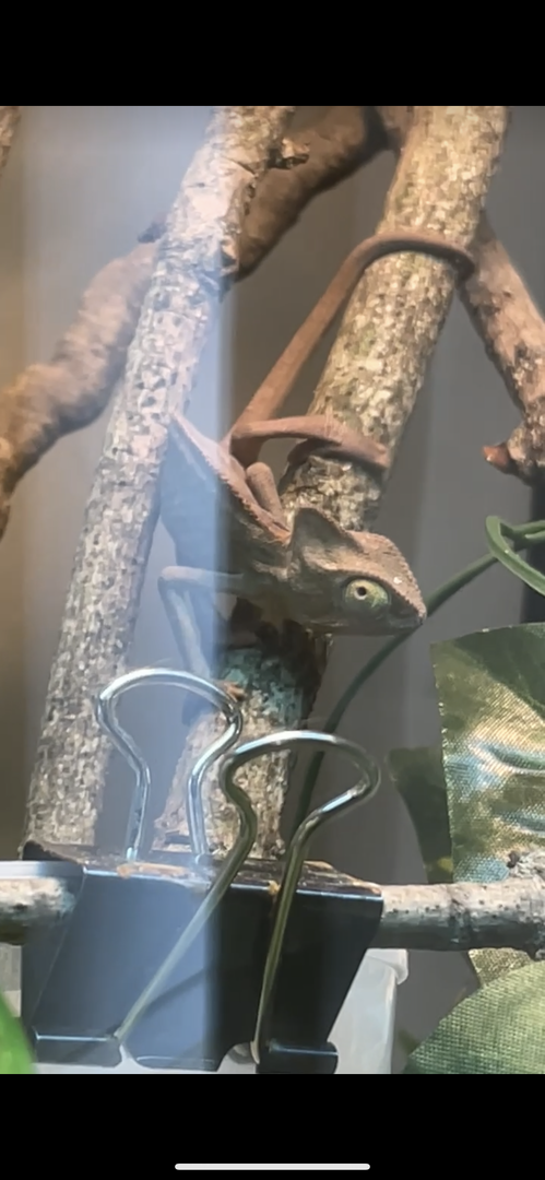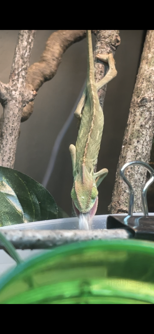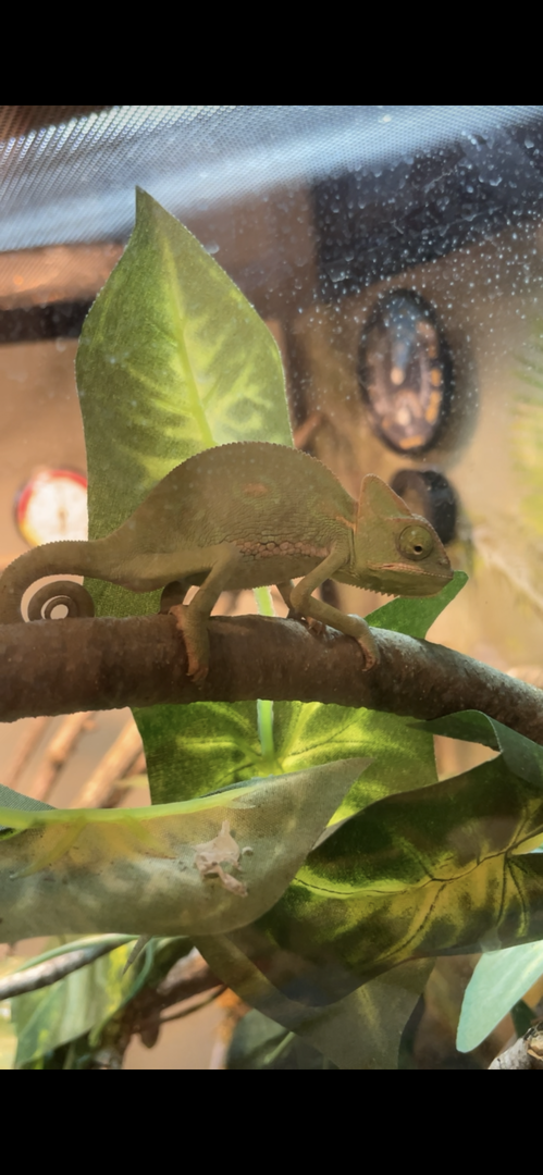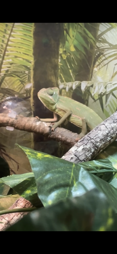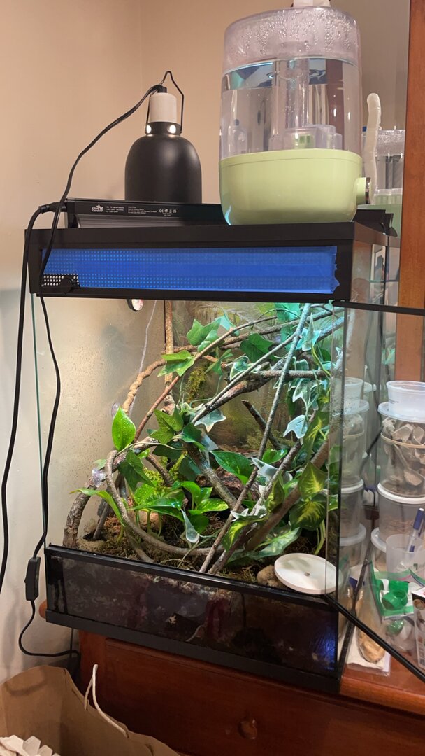 He has a 2ftx3-1/2 tank with a basking area 75w which stays around 85-90 degrees and cool side 75-70 uvb is a 24w 5.0 and that reaches both basking and cool side of the tank. Humidity levels stay 55 or above during the day and at night in the high 70s - low 90s. I have the misting system set to mist once during the day and twice at night for 10 minutes each. I do have some live plants in the cage ponthos. He’s not handled often as I don’t want to stress him out maybe once a week or less he doesn’t like to be handled.
