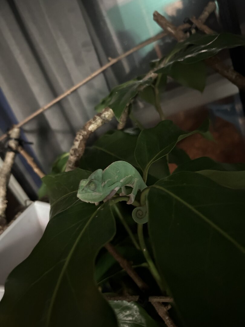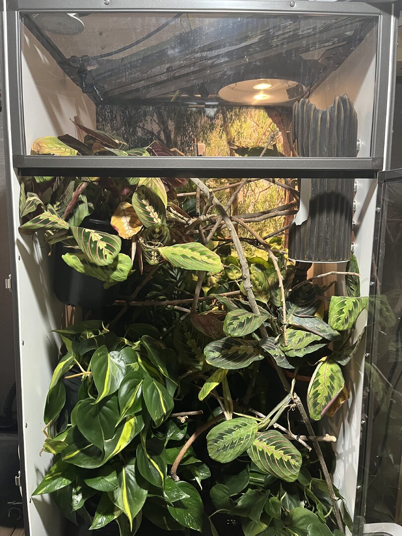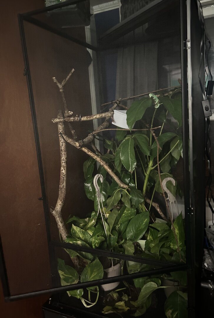- I would also suggest adding more plants and sticks especially near the top of the enclosure. You will want a linear branch running 6-9 inches below your UVB light so baby gets proper UVB levels every day. I'm suggesting more plants near the top because the current set up, while looks freaking fantastic near the bottom, is quite bare in the middle/top area. Chameleons need leafy places to hide and feel secure and many many sticks to move around their enclosure. I'll attach a picture of one of my enclosures to help give you an idea of what you are needing. I know Neptune the Chameleon has a video on how to attach more branches in your enclosure as well, I'd suggest checking it out if you need ideas or many of us on here have a lot of creative ways to attach branches too so just let us know what questions you have
