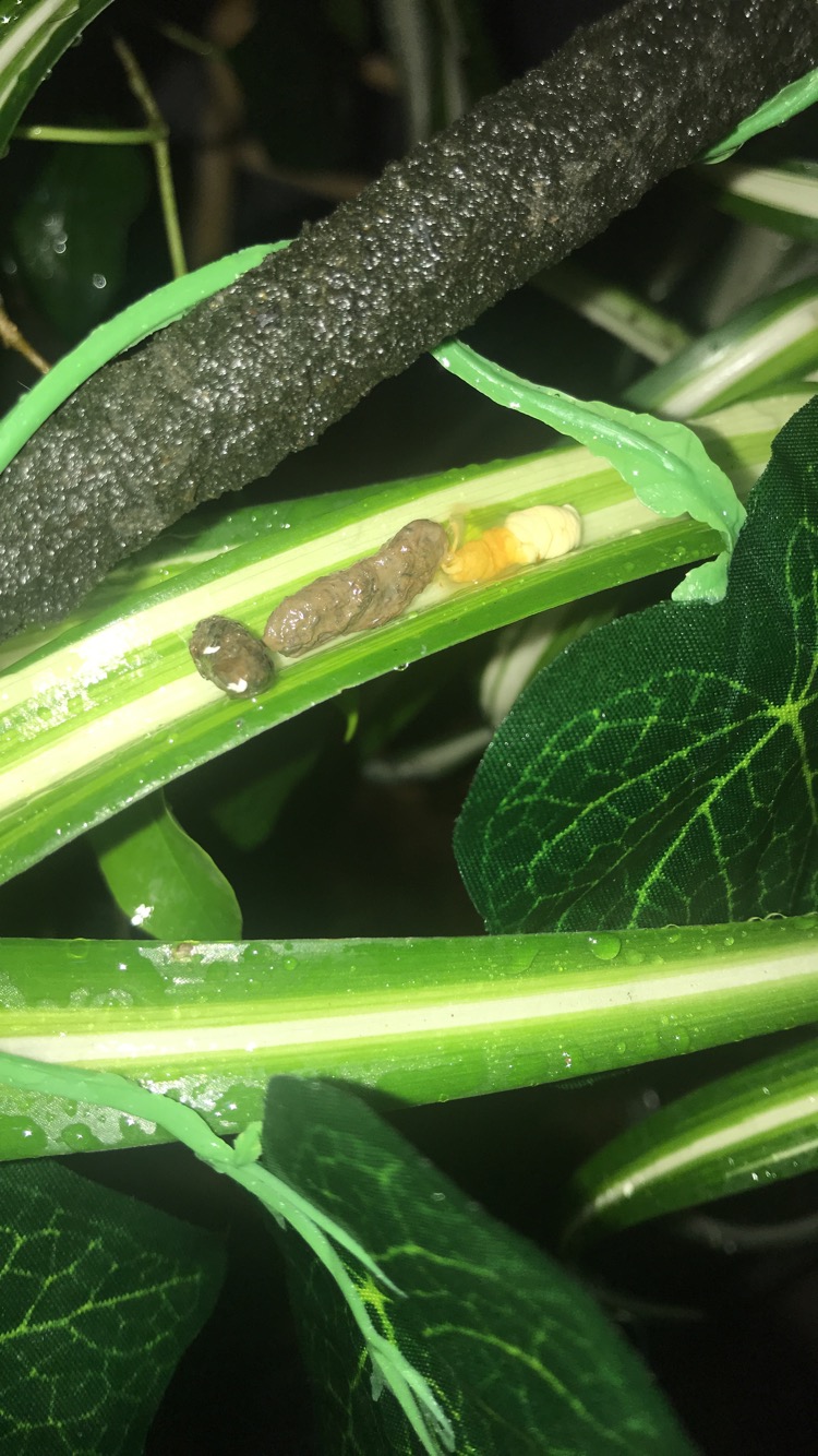 since your guy is still young and growing, he isn't going to be pooping as much as you think he should be, he still needs to keep some of the mass he eats to grow his bodyOkay, so while we are talking about "poop". I am NOT finding as much poop as I think I should find. Is it wrong that I want to be finding more poop? When I do find it, which sometimes may be every other day, it looks perfect, but it seems like he should be pooping more. The other issue is that he likes to sleep down in the middle of the Umbrella Tree which is massive now, and I think it falls down into there , but I check it and see if it falls on top of the leaves and on the rocks to remove it and I am not sure if it is making it down under the rocks or what? He eats like a pig, so there should be more poop, but I guess I should or should not be concerned if I cannot find it?