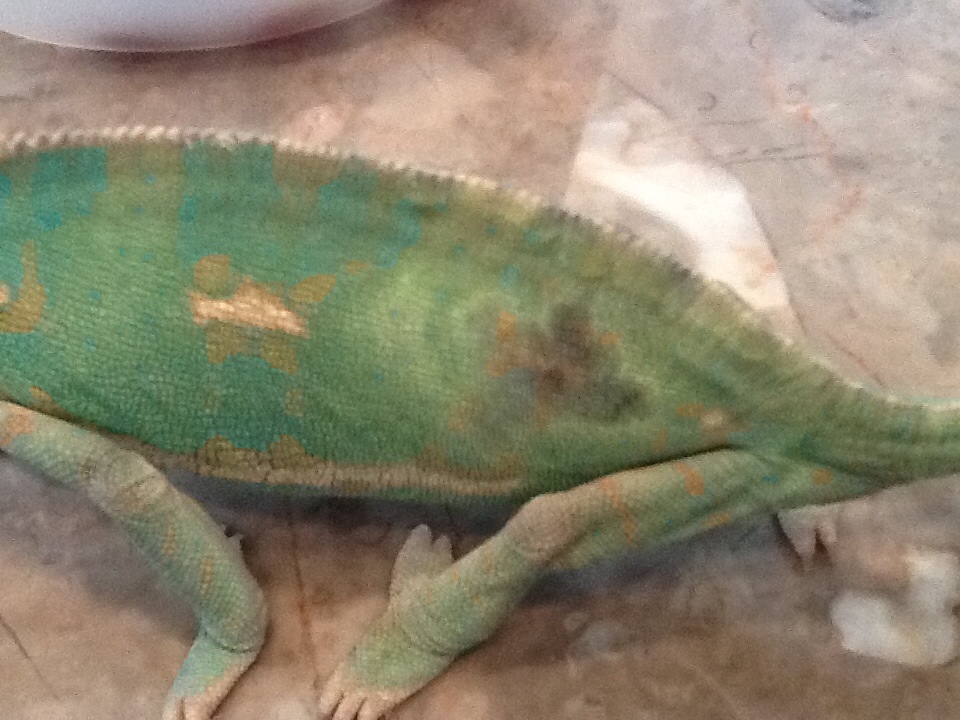 Help! My chameleon has blackish skin and yellowish see through bumps near her spine/ spikes