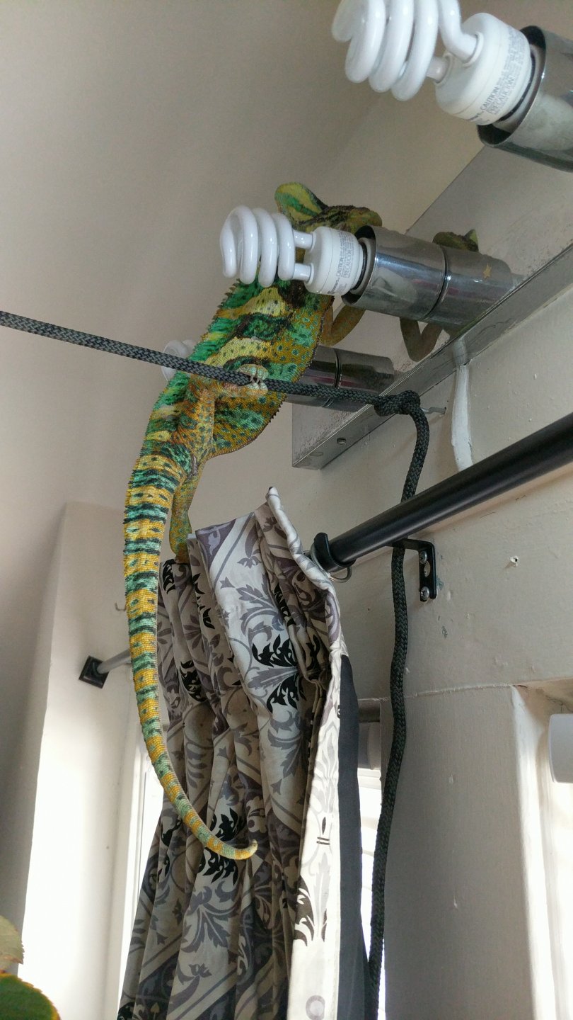 My chameleon will often walk along the curtain rod and against that wall there are lights on a setting where you can see your reflection. He's been in this area many times but recently he's been "head-butted" his reflection. No gaping but he does inflate his gular.