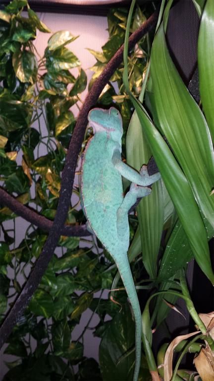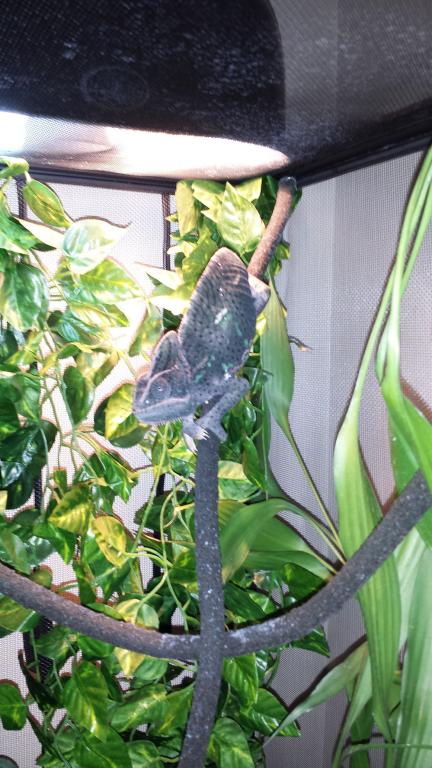 Two weeks ago, I moved my female veiled chameleon to a screen encloser from her tank I used to have her in. Prior to the move, she was usually a nice green color, no spots and enjoyed her encloser. After the move, she keeps a dark brown or black color constantly, but will return green when I take her out of the cage.