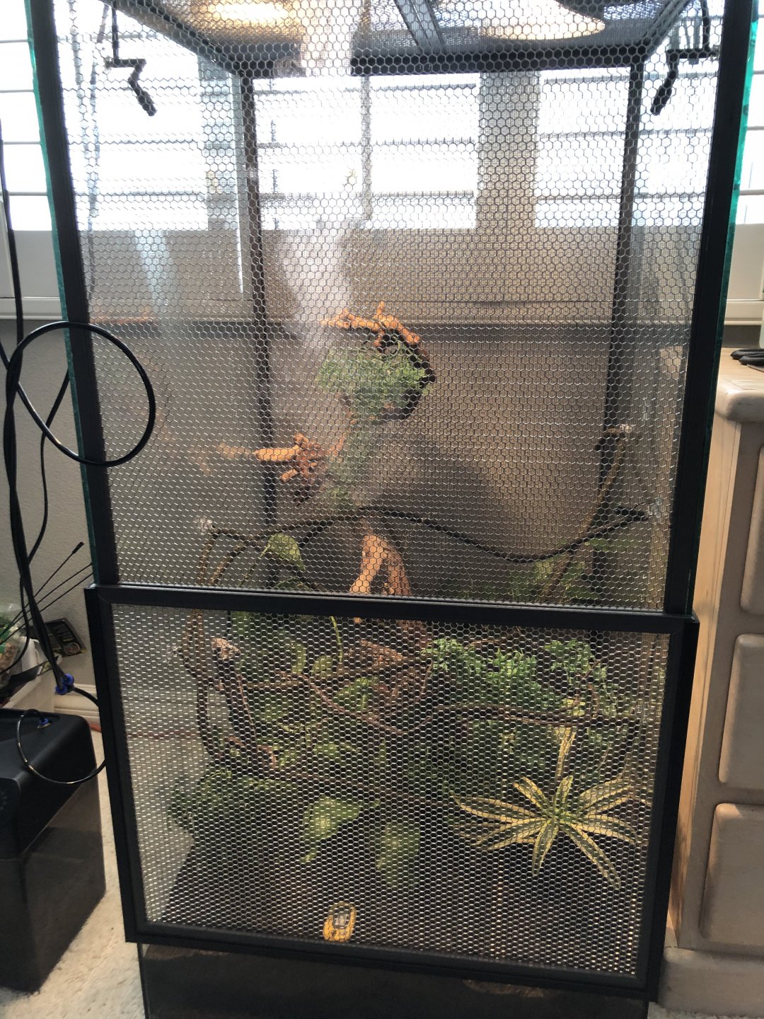 Watering - i spray his cage with a misting system for one minute, then drip water onto his nose. I do see him drinking fairly regularly.
