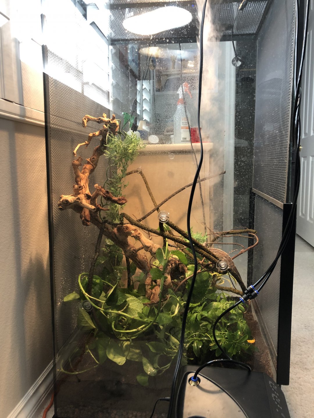 Plants - 6 plants, 3 small tropical plants I got at reptile store (I’m not sure what kind, but the employee told me they were safe) also a pothos, ficus, and dwarf umbrella, all very young and fairly small.