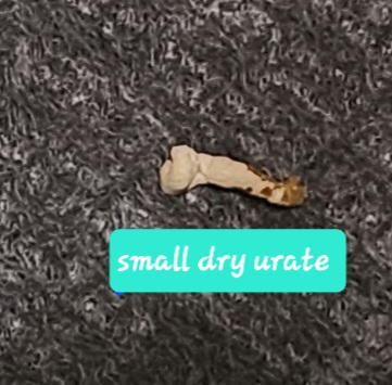 Adding these blood stained poop photos. After medication treatment- small, tiny dry urates/poop. Normal sized urates/poops have returned but are preceeded with blood.