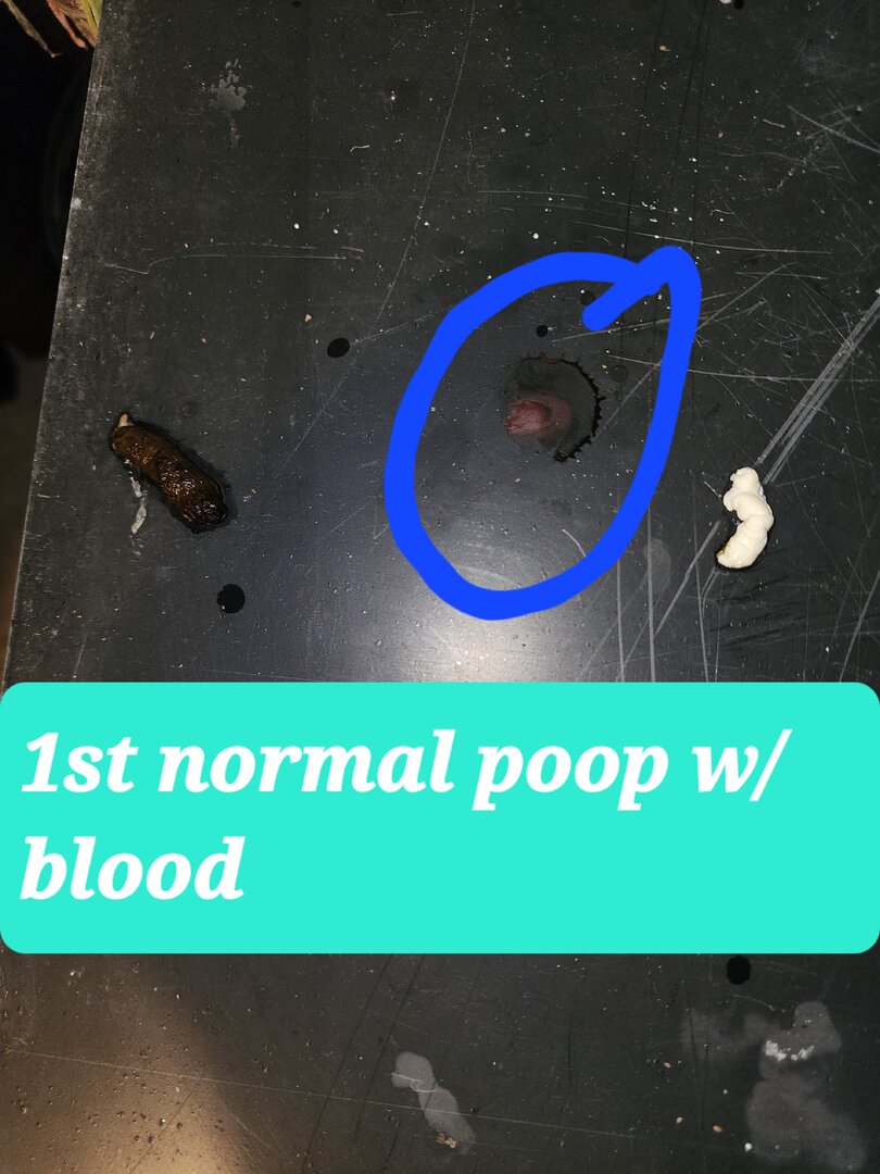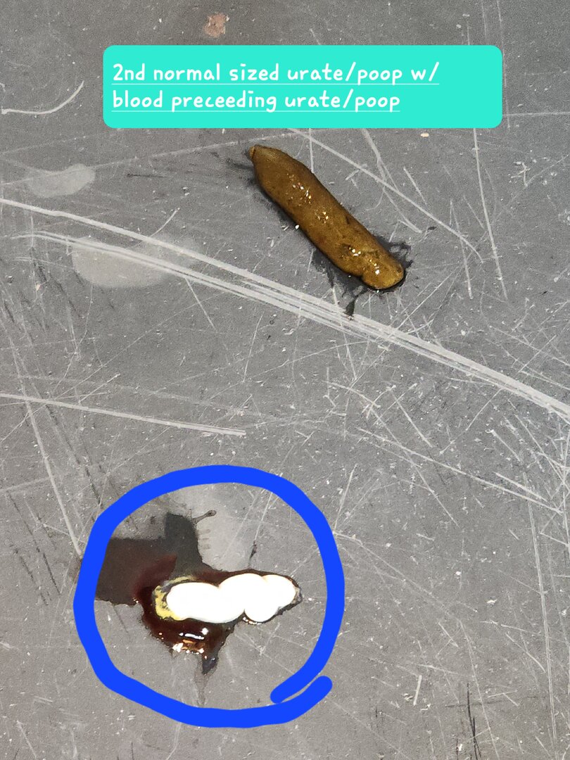 Adding these blood stained poop photos. After medication treatment- small, tiny dry urates/poop. Normal sized urates/poops have returned but are preceeded with blood.View attachment 334100View attachment 334101View attachment 334102View attachment 334103