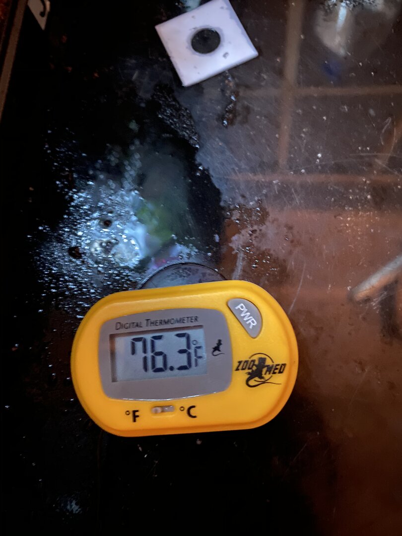 - Temperature - What temp range have you created (cage floor to basking spot)? Lowest overnight temp? How do you measure these temps? Basking temp usually stays around 90F during the day. 80-85F at night. Cage floor ranges in temp from 72F- 85F during the day. I’ve seen it drop between upper 60’s to lower 70’s at night. I measure the top temp with a Thrive Thermometer and Hygrometer combo and the bottom temp with a ZooMed Digital Thermometer.