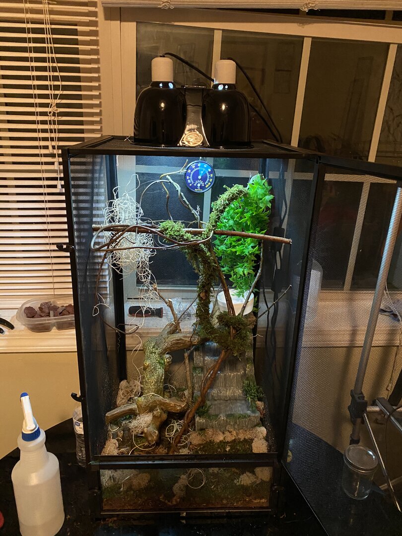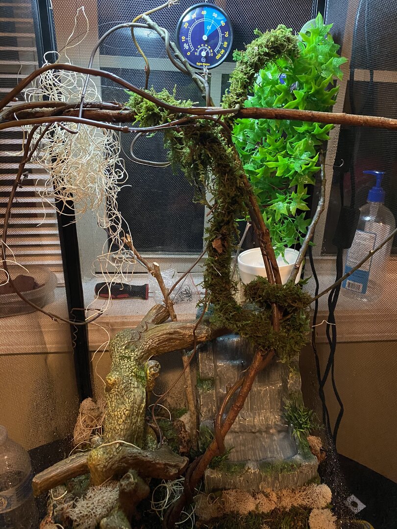 - Humidity - What are your humidity levels? How are you creating and maintaining these levels? What do you use to measure humidity? There are two different humidity levels. On the top the humidity ranges between mid 50’s to 90. Right now the top is at 58 it looks like. One time the hygrometer was reading 60 then fell to the bottom and read 100. This is how I keep the humidity up. First and foremost, I live in south Mississippi right off the beach. We have a subtropical environment and it is usually pretty humid here. Both outside and inside. I layered his cage with coconut husk and sprayed it to dampen then layered different types of moss that I bought in a pack from PetSmart. It’s a Thrive moss set that is used not only for decoration but also as a means of keeping humidity levels up. It comes with 6 different types of moss including a moss rope and moss sheets. I sprayed that down too to get it dampened. There is also a Thrive Tropical Waterfall Cascade in his enclosure. I clean it every other day.