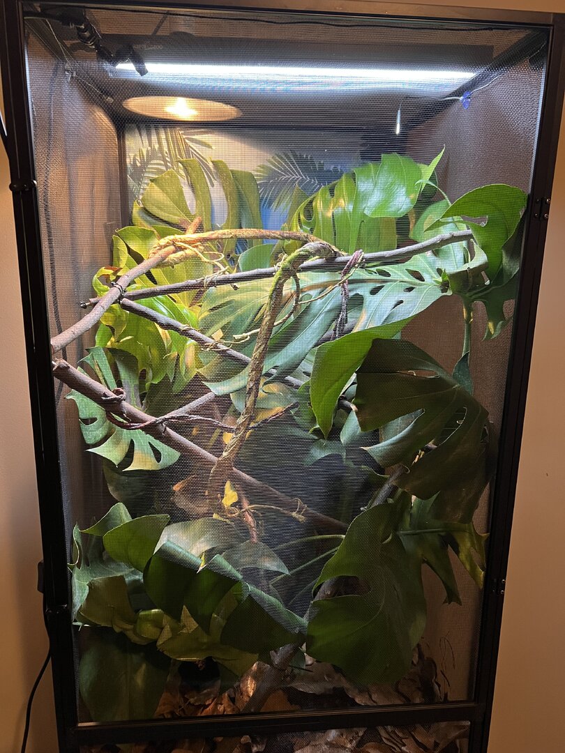 I think that gives enough background, to the problem we’re having! Our little guy is really slow to wake up in the mornings and it is concerning us. Lights on at 6 as mentioned but won’t even budge when we try to feed him in the morning. He will stay in the exact spot he slept in until around 11am. He is awake, but he is not getting up, just staying in his sleep spot. He has done this the past two days but once he’s up, he is active! He’ll sunbathe under the heat/uvb lamps and wander the cage. Is there something wrong with our little guy or is he just a slow riser?! Pics shown are his sleeping spots and a pic of his enclosure