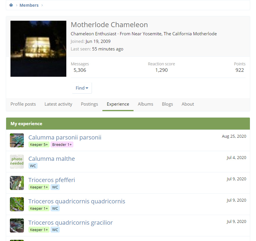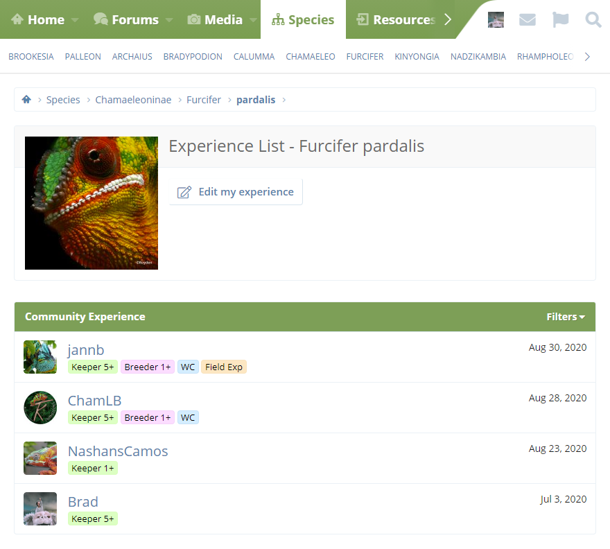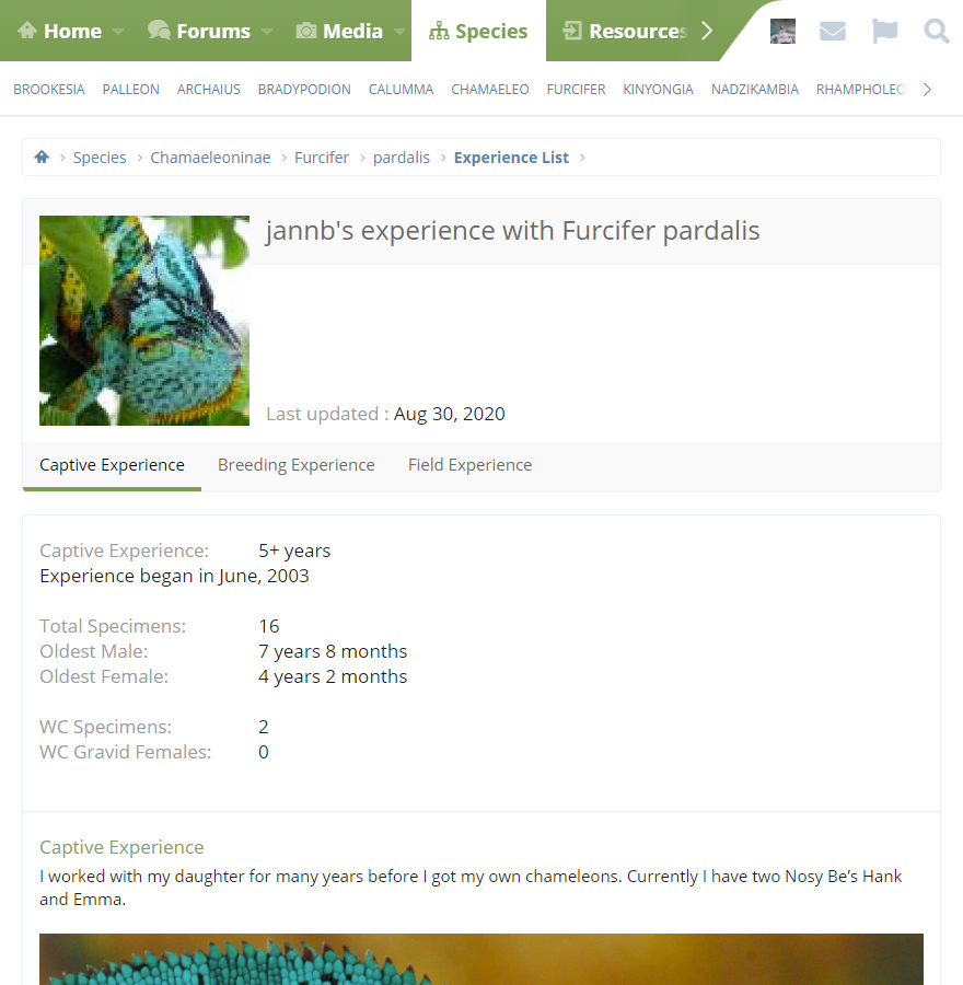 Above: A member's experience record for Panther Chameleons