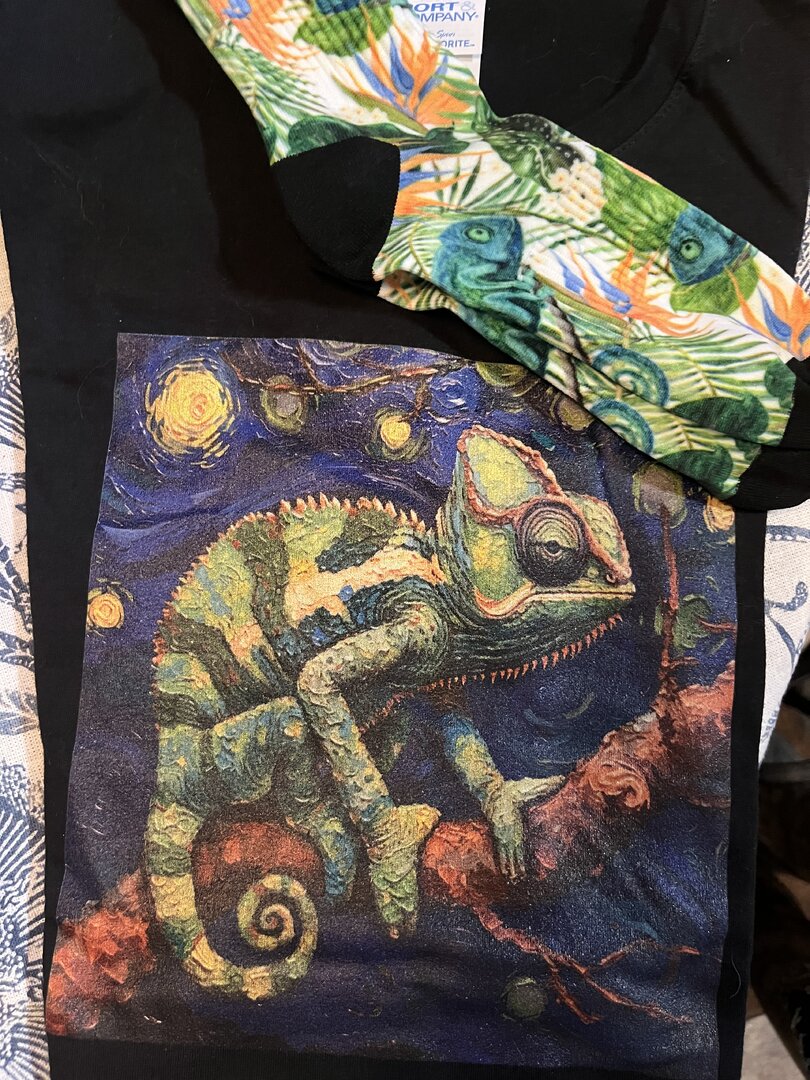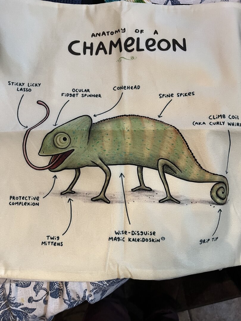 I received this 18x18 throw pillow cover of chameleon anatomy, the tee shirt and socks for Christmas from my staff at work. They know I’m a chameleon nerd.