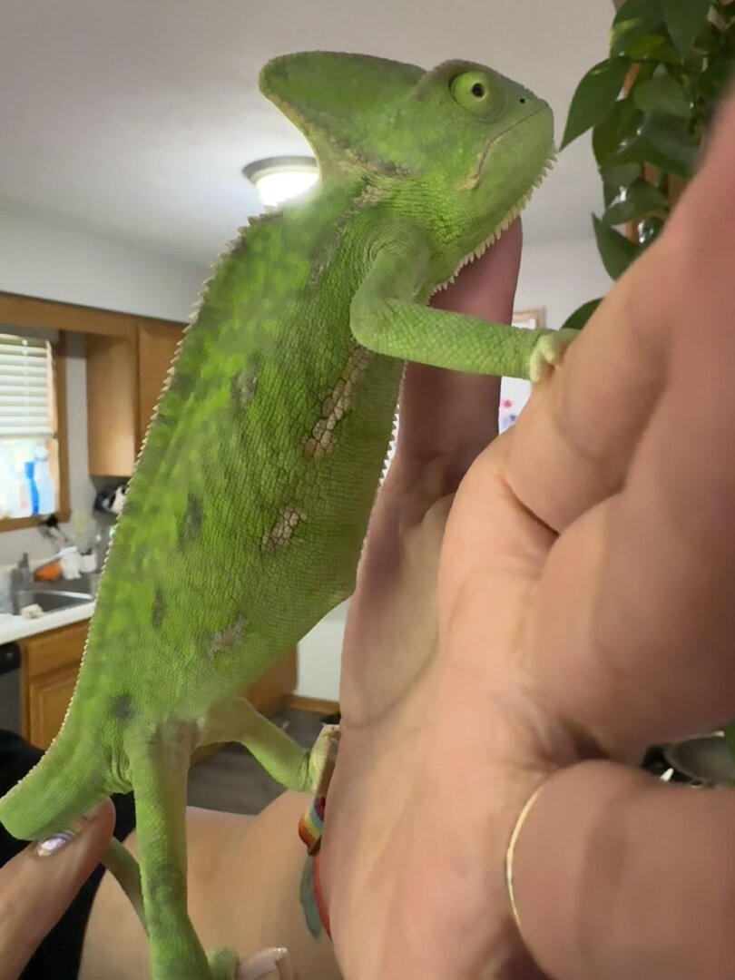 I made an egg laying bin but I someone told me they thought she had a parasite!Please post some photos of your chameleon from today so we can see all of her from the side.