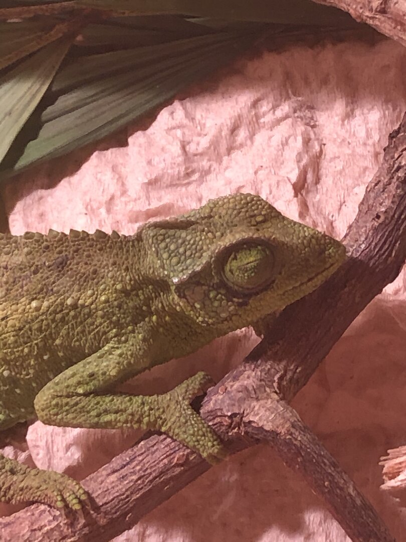 Current Problem - One morning, I walked outside to get lilikoi and saw her out in the open on the forest floor. The chickens were sprinting over (I often feed them, they belong to my landlord) so I scooped her up because I knew they would peck her to death. I noticed something was very wrong because her eyes were shut, she was very skinny, lethargic, and dark in color. That day I brought her to a vet who deals with exotic animals and has treated Jackson Chameleon’s before. He said she had parasites and gave her some shots and deworming medicine, as well as an anti-inflammatory. I fed her a nutritional gel he gave me through a syringe he provided me, and have been feeding her crickets by gently opening her mouth and putting them in. She gobbles them right up once in her mouth, but doesn’t try to grab them herself even if she feels them on her nose. I also use a syringe to put water in her mouth. I brought her back to the vet today, a week later, and he said she was much healthier, more active, and had put on a good amount of weight since I found her. What puzzled both of us is that even after examining her eyes, he found find nothing wrong with them. No swelling, pus, discharge, or abnormalities, yet she will not open them. He told me typically they open their eyes once they are feeling better, and she has been treated for the parasites and has gained weight. She looks so great compared to before, the vet was shocked at how quick she recovered. He was thinking that there could be some sort of issue where she can’t open her eyelid, but wants to research the topic more because this is unlike what he’s seen before. As I said, when he opened her eyes, they looked healthy and clean and had no swelling, puss, discharge or abnormalities. She just won’t open them. Please please tell me if you know what this may be! I love her so much and want her to live a happy, healthy life (I’m aware I need to make many changes with her cage, feeding, supplements, etc, forgive me I am very new to this and I’m just trying to learn as fast as I can. If I knew I was getting a chameleon I would’ve done my research beforehand, but this happened very suddenly)