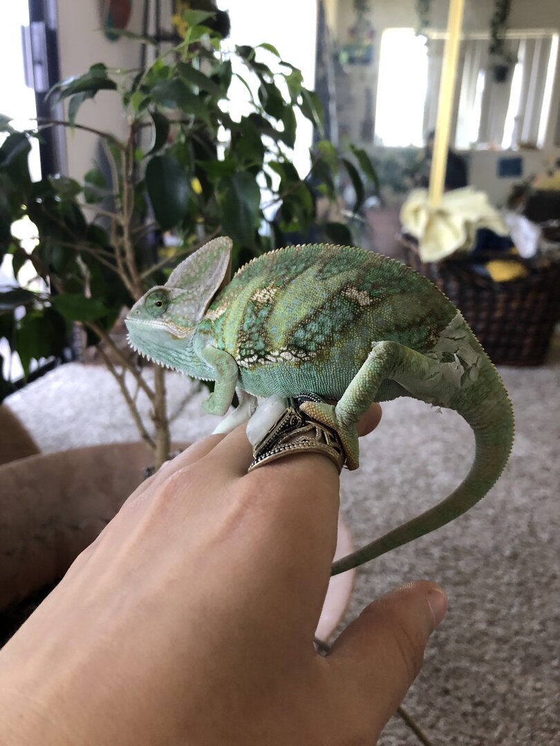I have a veil chameleon he is 9 months and when I was given my chameleon he had an eye issue which was fixed and now he has it again! I work at a vet clinic and we’re looking to see what’s wrong with him 100% Due to a few things that happened at my current house I cannot keep him here and I wish I could ! I have everything he needs and more and I just want a good home for him if I knew I couldn’t keep him I wouldn’t have taken him in he was just sick and I wanted to help him a doctor I work with told me it’s a possible sinus infection he eats veggies and has constant gut loaded insects ! Mister and dripping system for him along with a packed cage + live plants! His right eye is the one with a bulge ): Please if anyone in the Bay Area or 925 area in California can take him and make sure he has a good home 100% let me know I would do anything for my baby ! His name is Mac and he’s a very sweet baby he’s just a little shy and nervous at times!