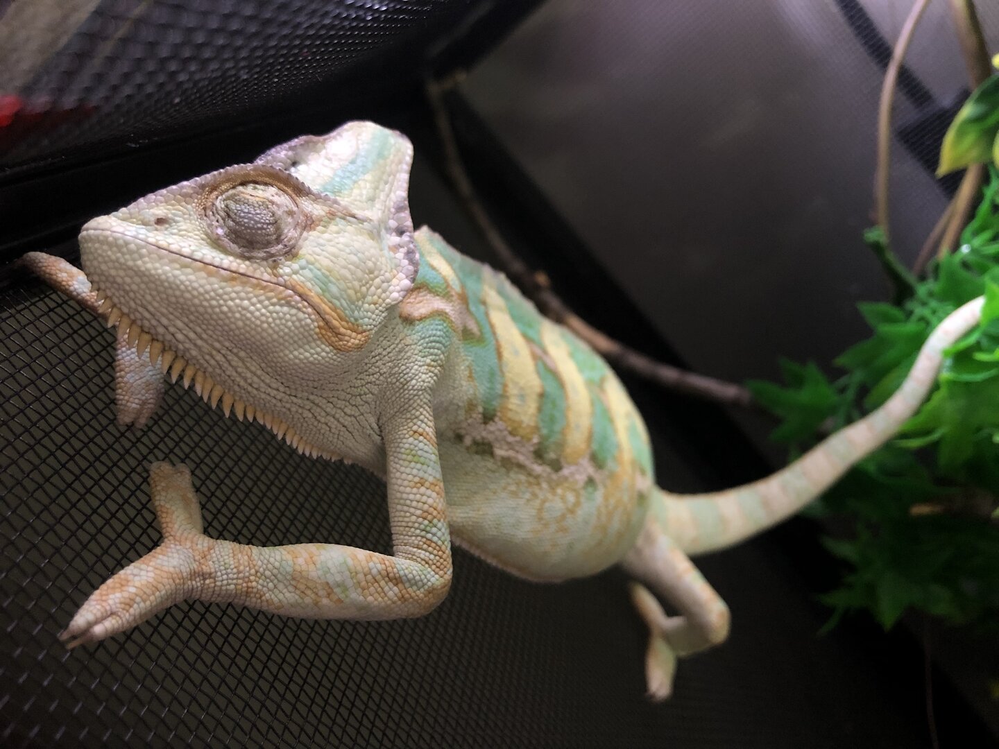 Housing is the standard chameleon starter kit with the addition of a Ficus repotted in organic soil and leaves washed in soap and water. (watched the vid tutorials)
