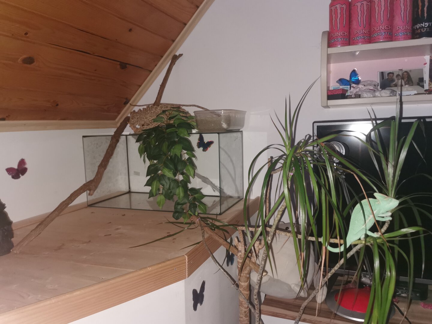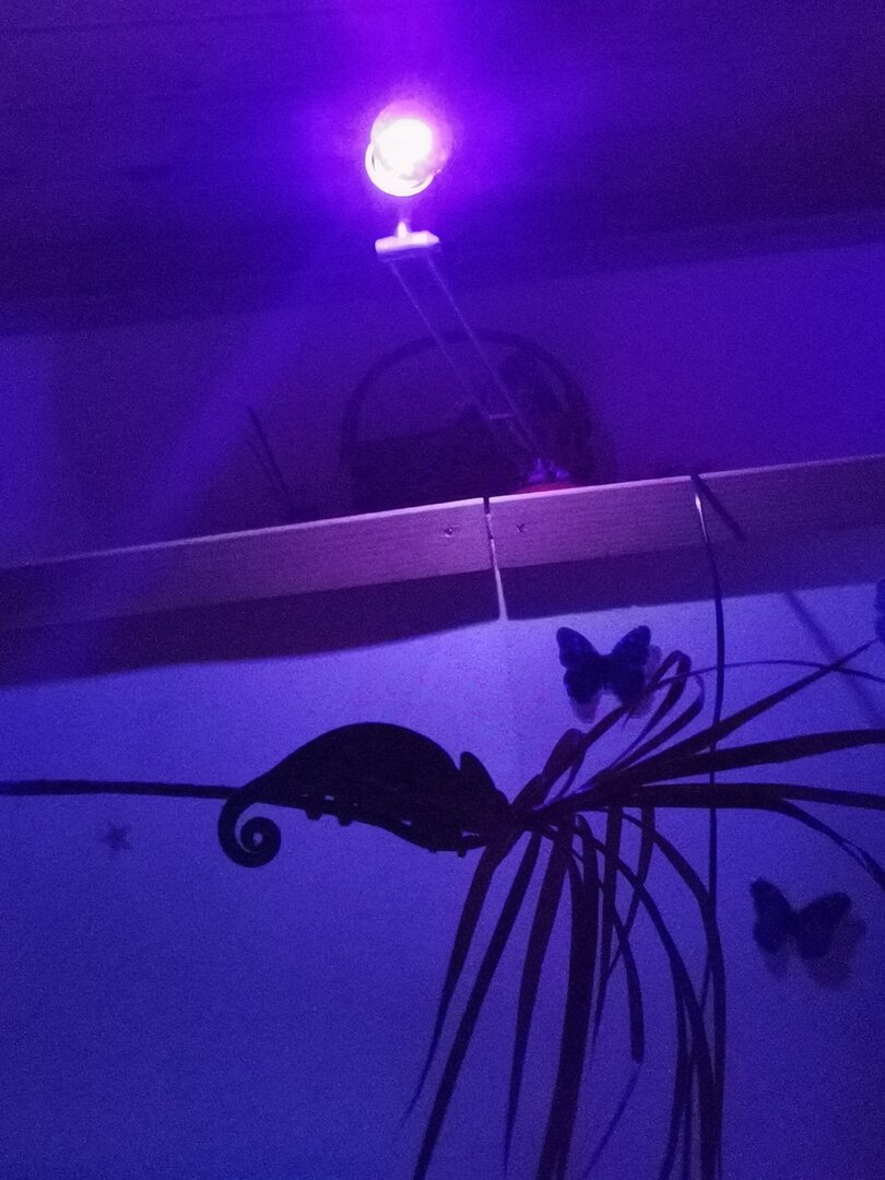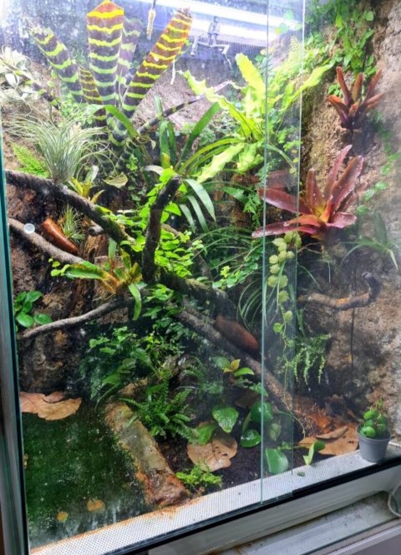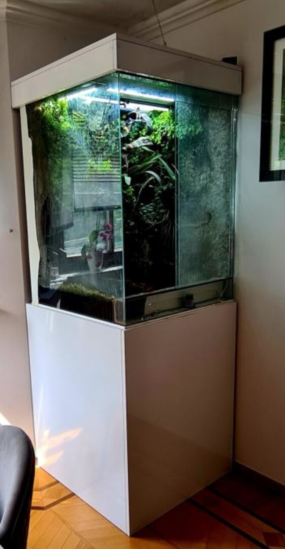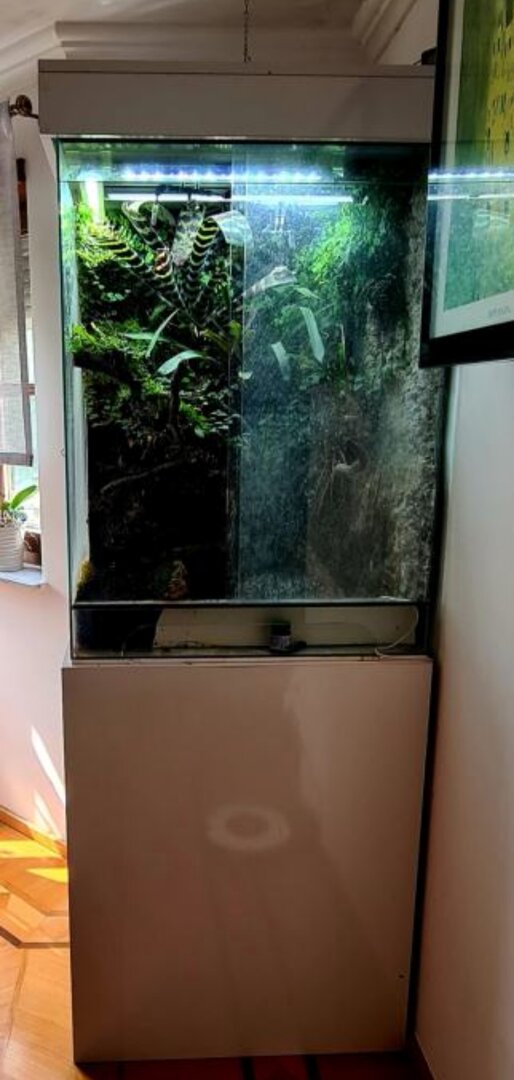 For the enclosure: You have what appears to be adequate space, but with it being glass, you DEFINITELY need airflow. Is there a screen on the bottom of the cage as well? In that little door area? For cages that aren't screens you want to make sure you have what we call the "chimney" effect. That's where air can circulate through the cage and keep from being too still and stagnant. On top of my cage, I have a computer fan that helps pull the air through. I have a small screen area at the bottom of the cage, and a screen on the top. By putting a fan that has the air being pushed upwards, it sucks air from the bottom to the top and allows good airflow, the cage to dry out between mistings, and my cham's lungs to remain healthy.