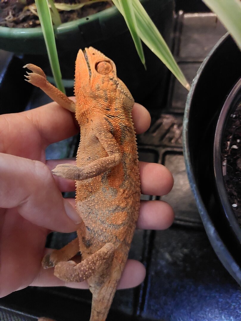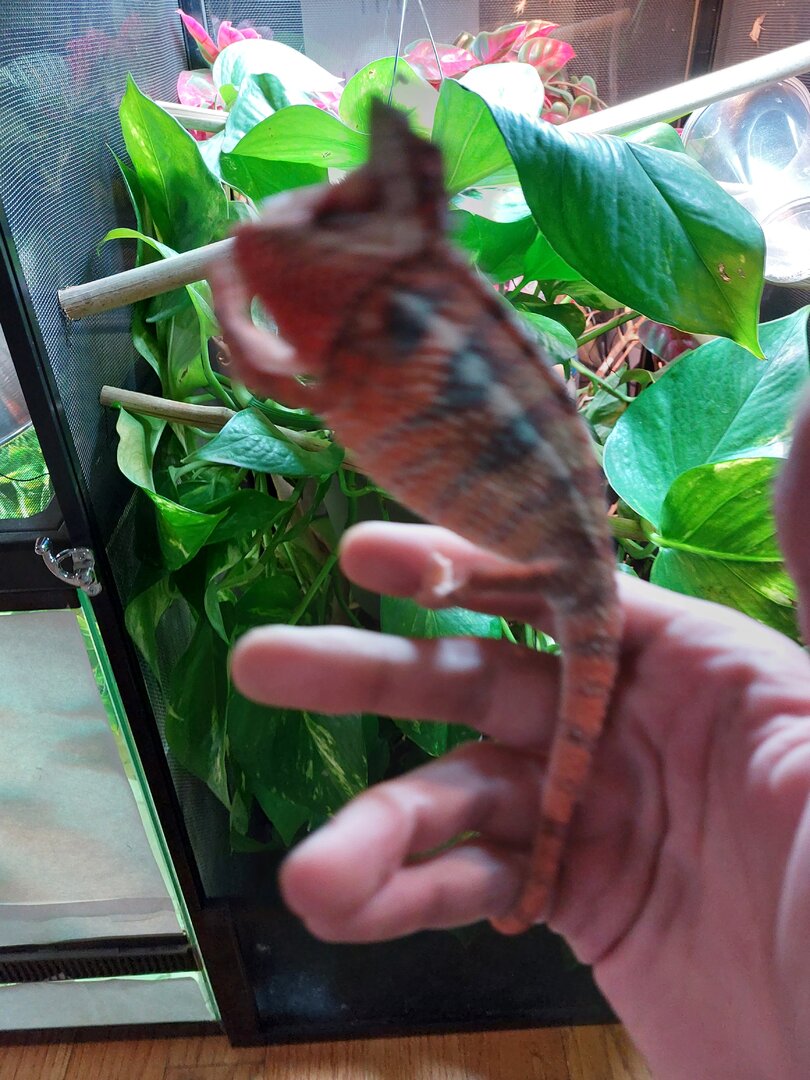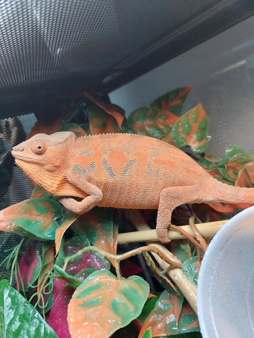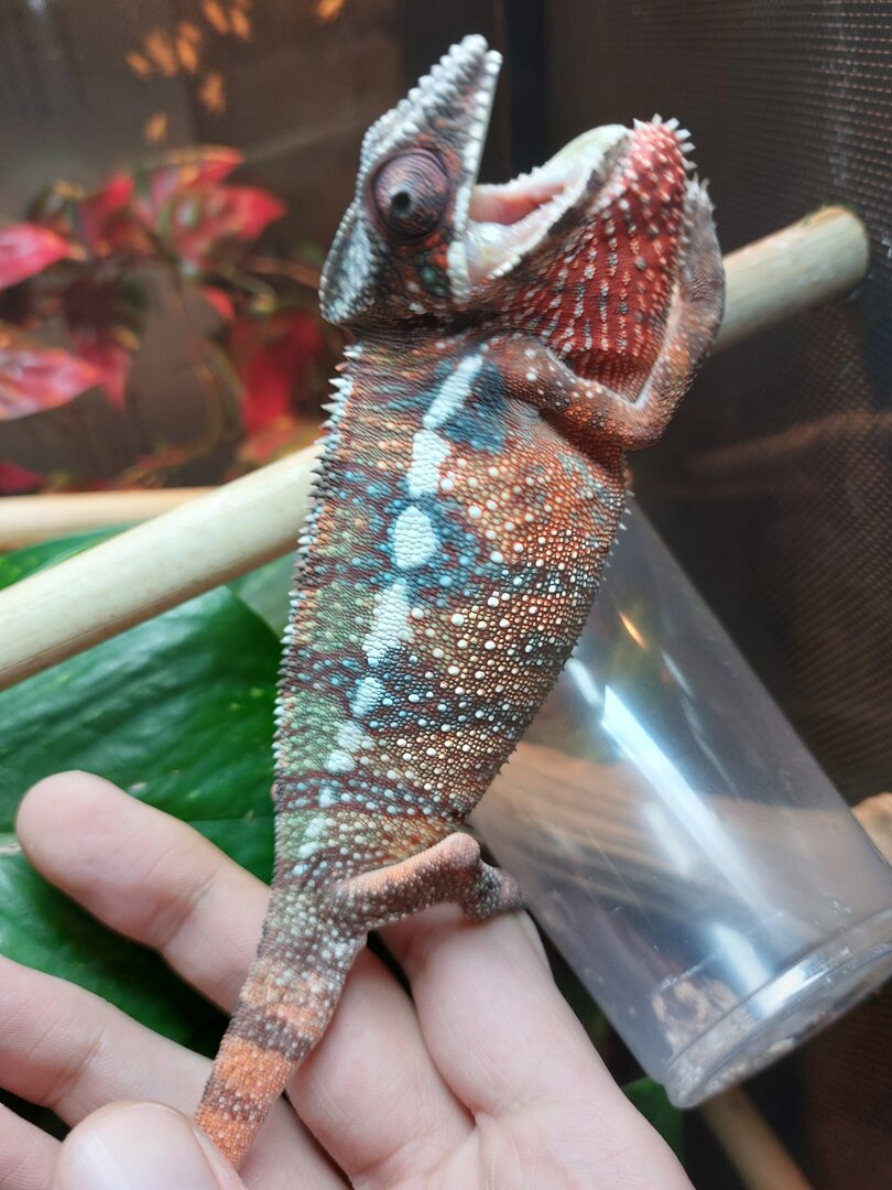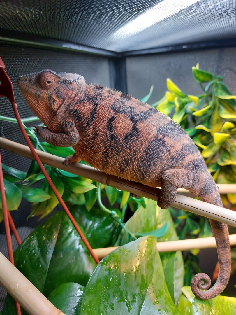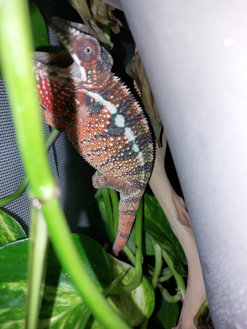 I'll post a photo of my male panther haven't took any recent of the others as he's newest an coolest lol. Not best photo but he's quite mean. Doesn't like his photo taken. Females are alot nicer. They like climb behind my head when I mist them during the day. Mostly older panther female that does this. Father of this male panther is Yellowstone. From a private breeder I found on another forum site. Maybe he's known on this site no clue.