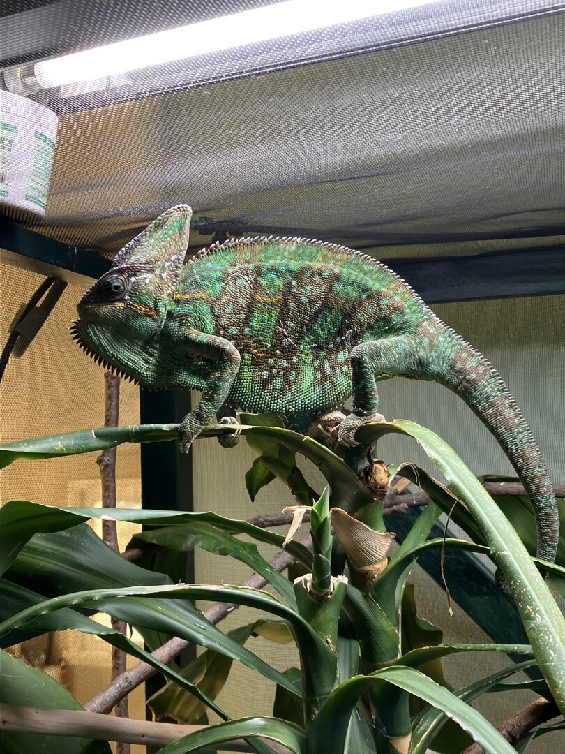 So, my adult male veiled chameleon (4.5 years old) has been acting a bit strange behavior wise when I tried to feed him both today and yesterday. I cup feed him, and yesterday he ignored the bugs and instead eagerly climbed straight onto my arm. Today when I went to feed him, he seemed eager to climb on my arm again, and at first ignored the bugs, then he ate them though. Then, he used my arm as a bridge to get on top of the open door of his cage, where he has been resting for awhile, seeming content. I am wondering if something is wrong inside (nothing has changed for like months, other than the temperatures have been a lot higher since my room is on the top floor and the heat of summer really heats it up) or if he is looking for a mate or something? His coloration is also very different in summer than it is in any other time of the year. He basically stays dark brown for most of the day, so I am wondering if that is a bad sign or not. I will attach pictures of him as well. Thank you!