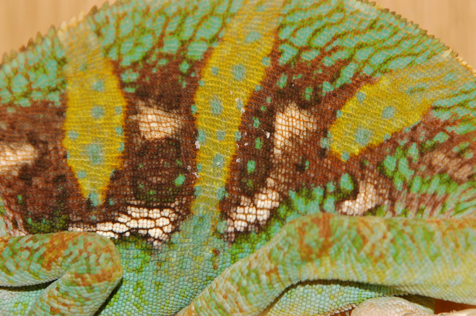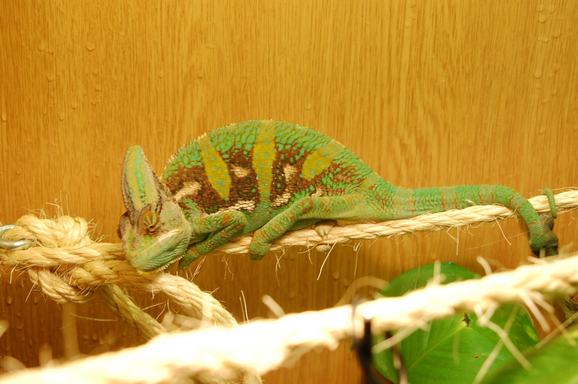 Our 4 month old Yemen Cham (Charlie) has been very happy up until a week ago. We noticed that as soon as we get up in the morning he start shedding straight for the bottom of his house and hides behind the ficus pot; his colours go grey - black. By the time we get home from work he is fine -colours are back to normal and he seems happy. However, I stayed home from work on Friday and he didn't start to climb his house until 2pm. I spoke the reptile shop and they confirmed we are doing everything as we should in terms of temperature etc. and suggested we cover his house at night. We did this and he seemed a lot better on Saturday and Sunday morning with no trips down south. This morning however, he went straight to the bottom of his house and his colours were very dark.