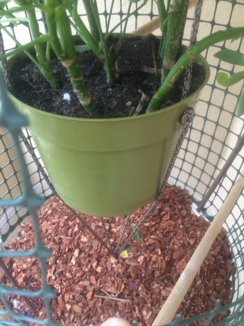 GOOD NEWS! You’re damn near done! WOOO! The final steps to this will vary upon your personal preference. Since your project is ready to be hung, find a place to install your hook. Once it’s installed, test your enclosure to make sure the knot of parachute cord you tied at the top can lift it. This is when you will notice the plant suspended and, if each step was executed properly, level (if not, adjust by untying the parachute cord on top or bottom and pulling inside the enclosure via the door; adjust; redo knot when finished). If everything seems A-ok then it’s time to throw it up on the hook! Make sure the knot is above the hook (if you didn’t already know). To conclude your project, add the bark and any other decorations you desire. I would strongly advise a dripper which can be made very inexpensively and easily. Use the search tab on this forum to look up “DIY dipper”. This can be hung somewhere near the cage and the airline tubing easily inserted through one of the holes in the fencing. Also, I used dowels for braches and zip ties to hold them up. That’s totally up to you. I just prefer dowels ‘cause I cut each to length. Another reason is that I can buy different sizes to accommodate to healthy exercise for my cham. It’s said that different thicknesses of branches is beneficial for your chameleon’s well being. Again, it’s all up to you, for these are all just suggestions. Enjoy your new enclosure knowing your cham can get a sweet tan outdoors now! Just kidding!