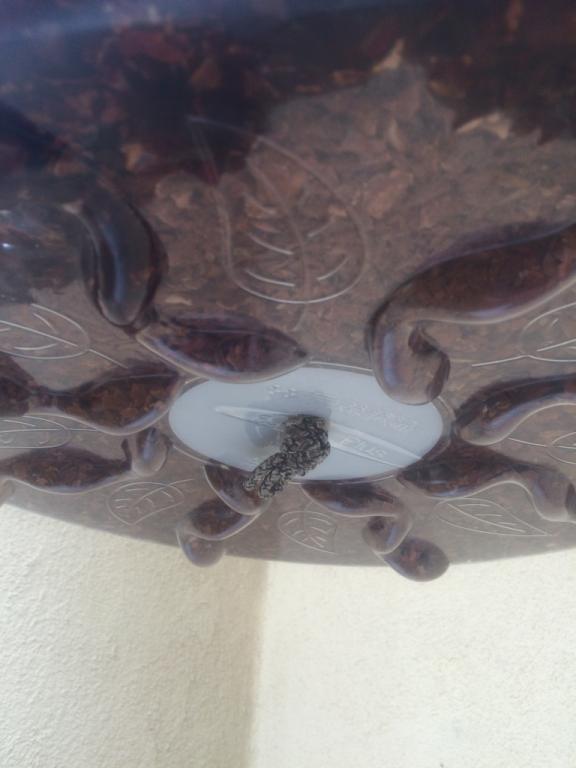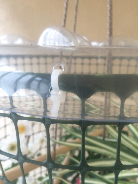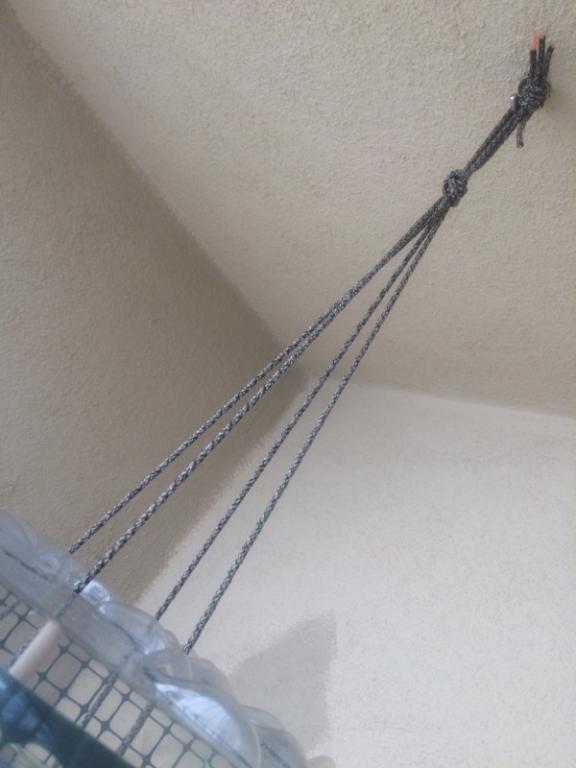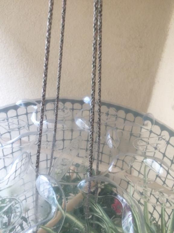 **Note: This, too, is optional, but I strongly recommend it. I figured it is going to put less stress on the bottom saucer of the project; a heavy plant placed directly on the saucer may cause the saucer to snap.** This part can be a bit tricky. I would also suggest you look at the picture of how I hung the plant mid air in the cage for this. With the four strands you have coming out of the top of the bottom saucer, tie one knot in each about a quarter way into the remaining lengths. Try your best to make sure they are all even with one another!