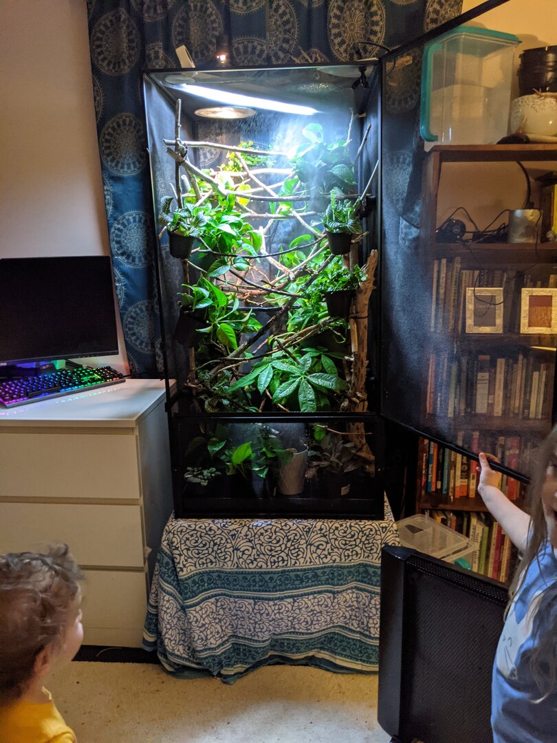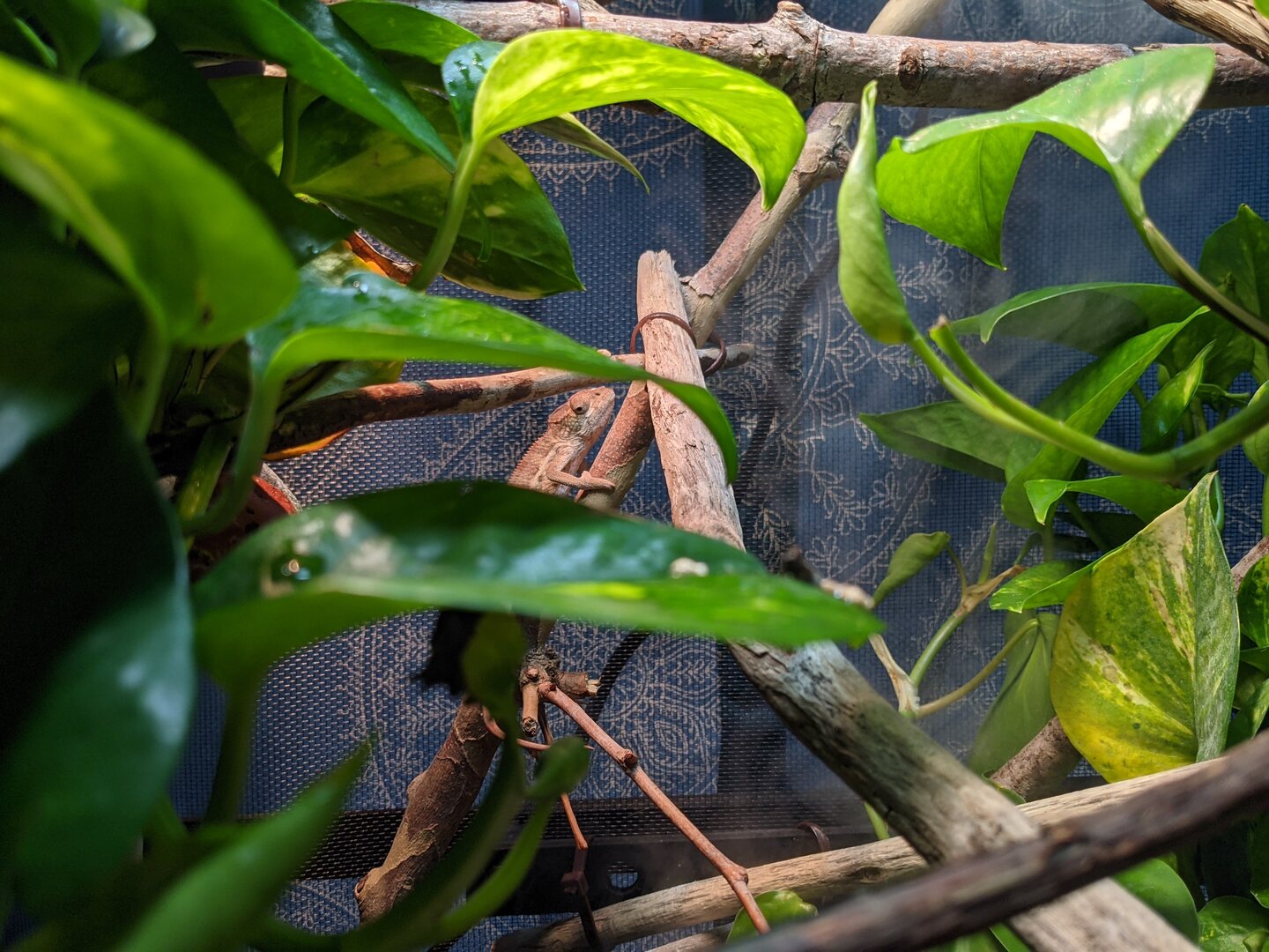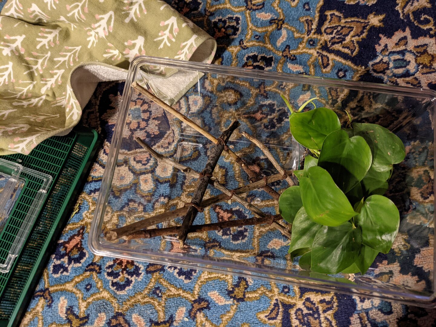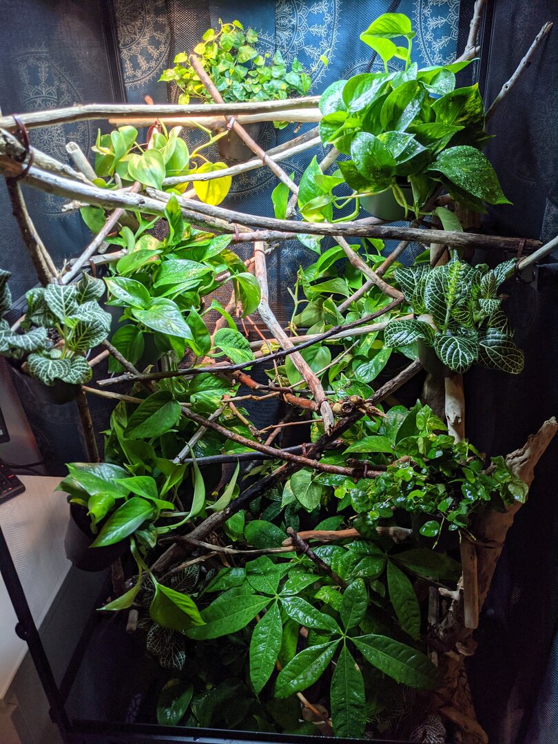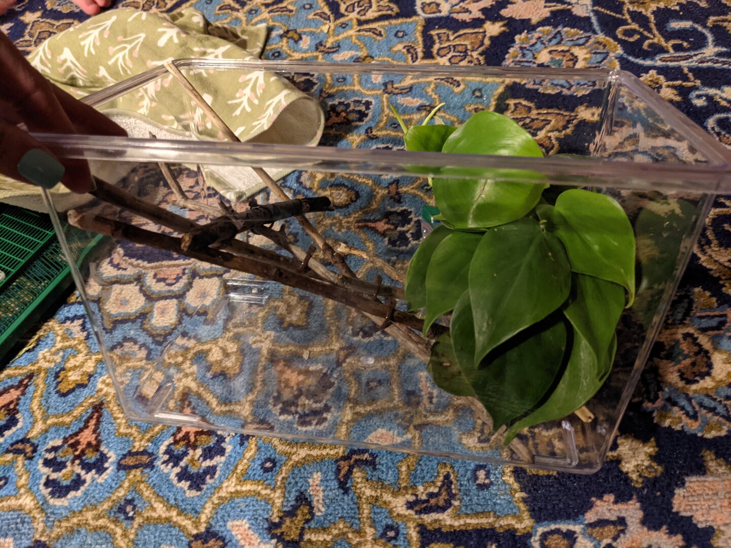 my sticks are driftwood that I washed in my bathtub several times. I licked one and it wasn't salty and I didn't die so I am hoping they are ok. I hope to get more branches. I washed all the leaves off the plants, put some large-ish washed smooth beach rocks in the dirt. Put organic veggie soil where I could on top of plants. Some pots are doubled for easy removal. I used about 92 8' zips and 15 4" zip ties and used a nipper to cut the thingy off the end of the zips. I turned them down so the chameleon doesn't touch the sharp part and I may sand sharp ones down.