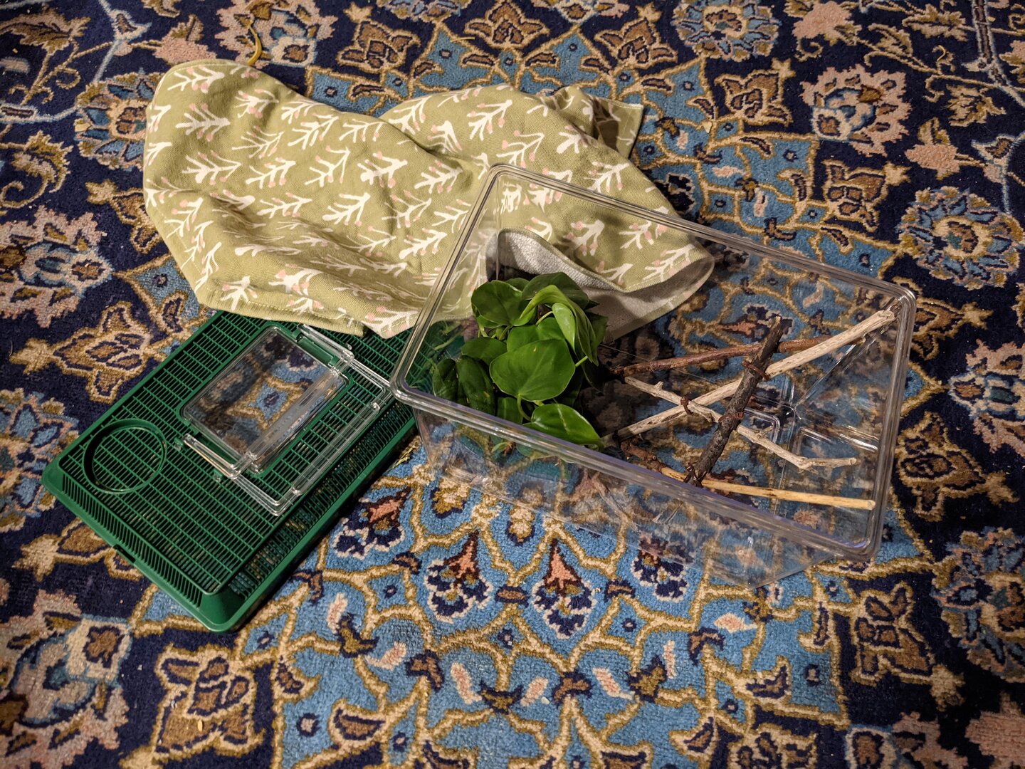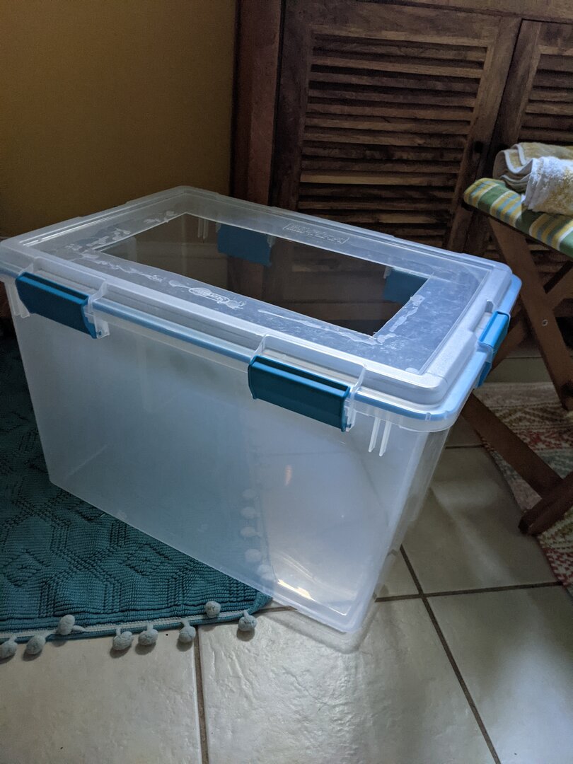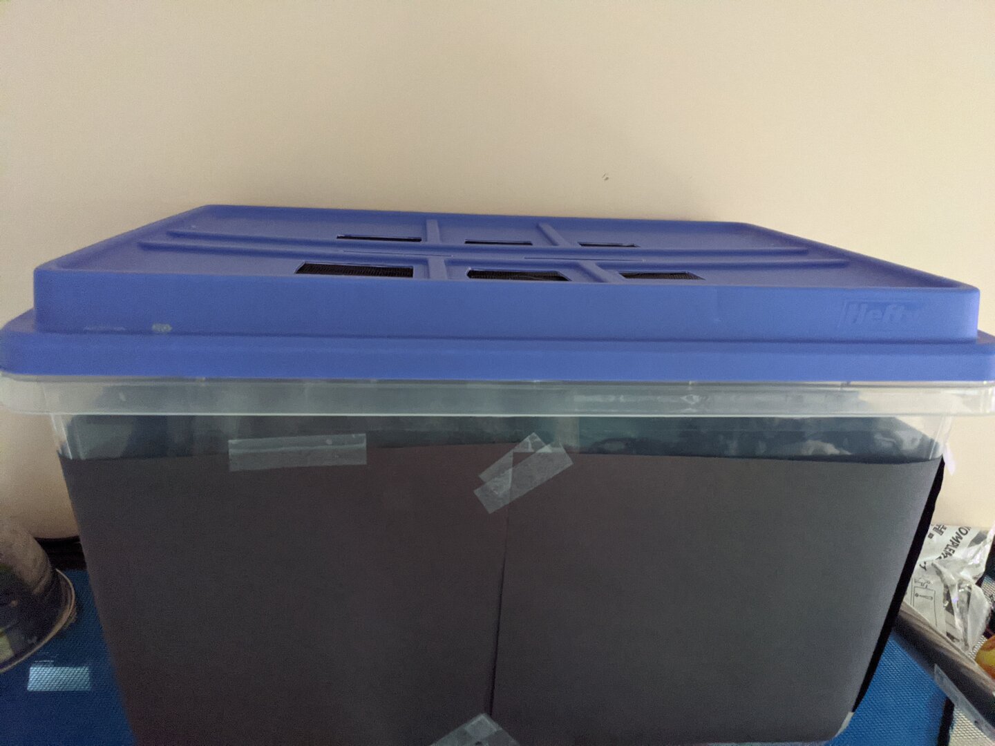 I need to figure out a drainage system. I can drill a hole in this end table I got from grandma. Right now my roach-bin-to-be is under it, and it fits so nicely! I will need to get drainage, though.