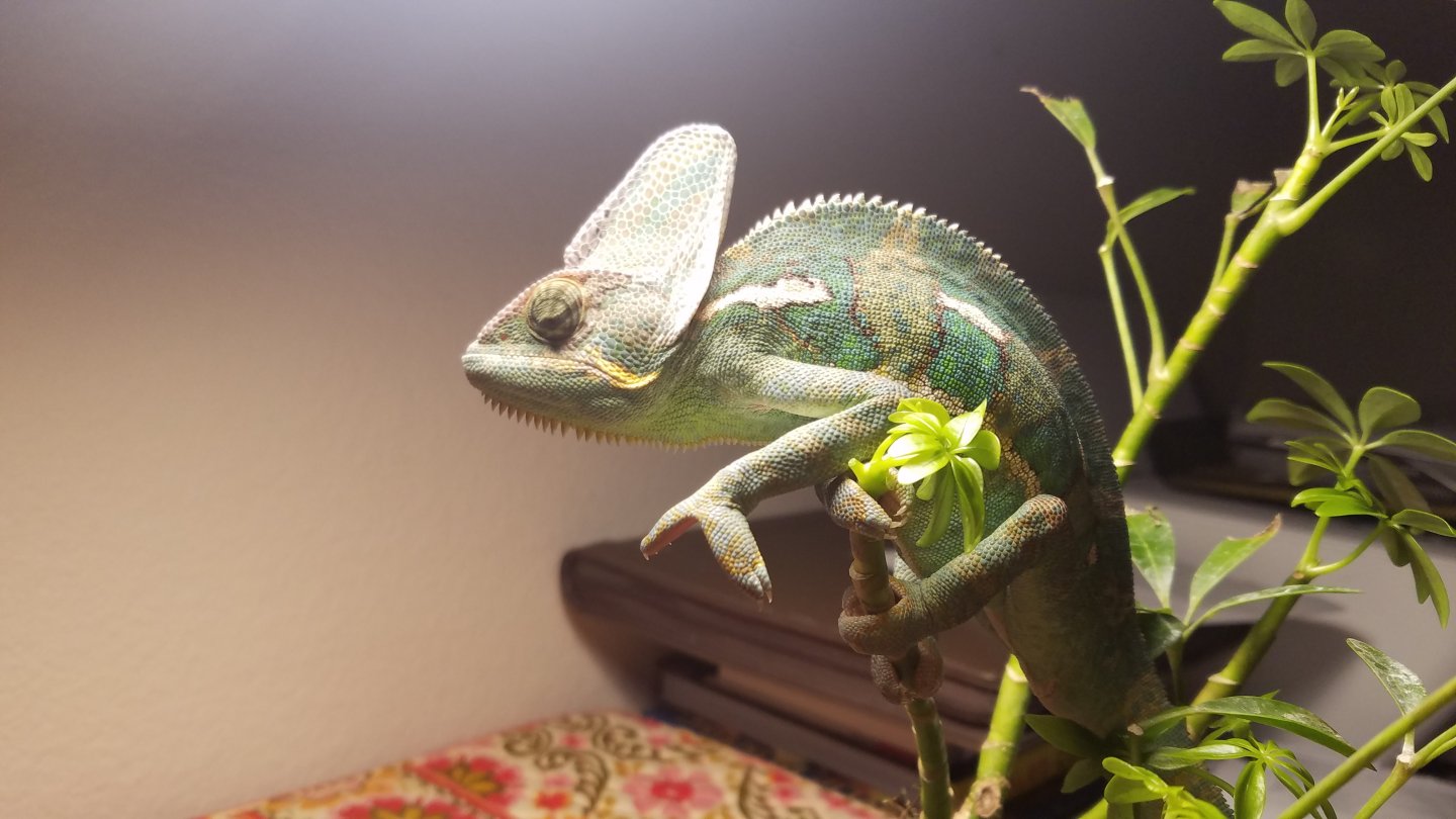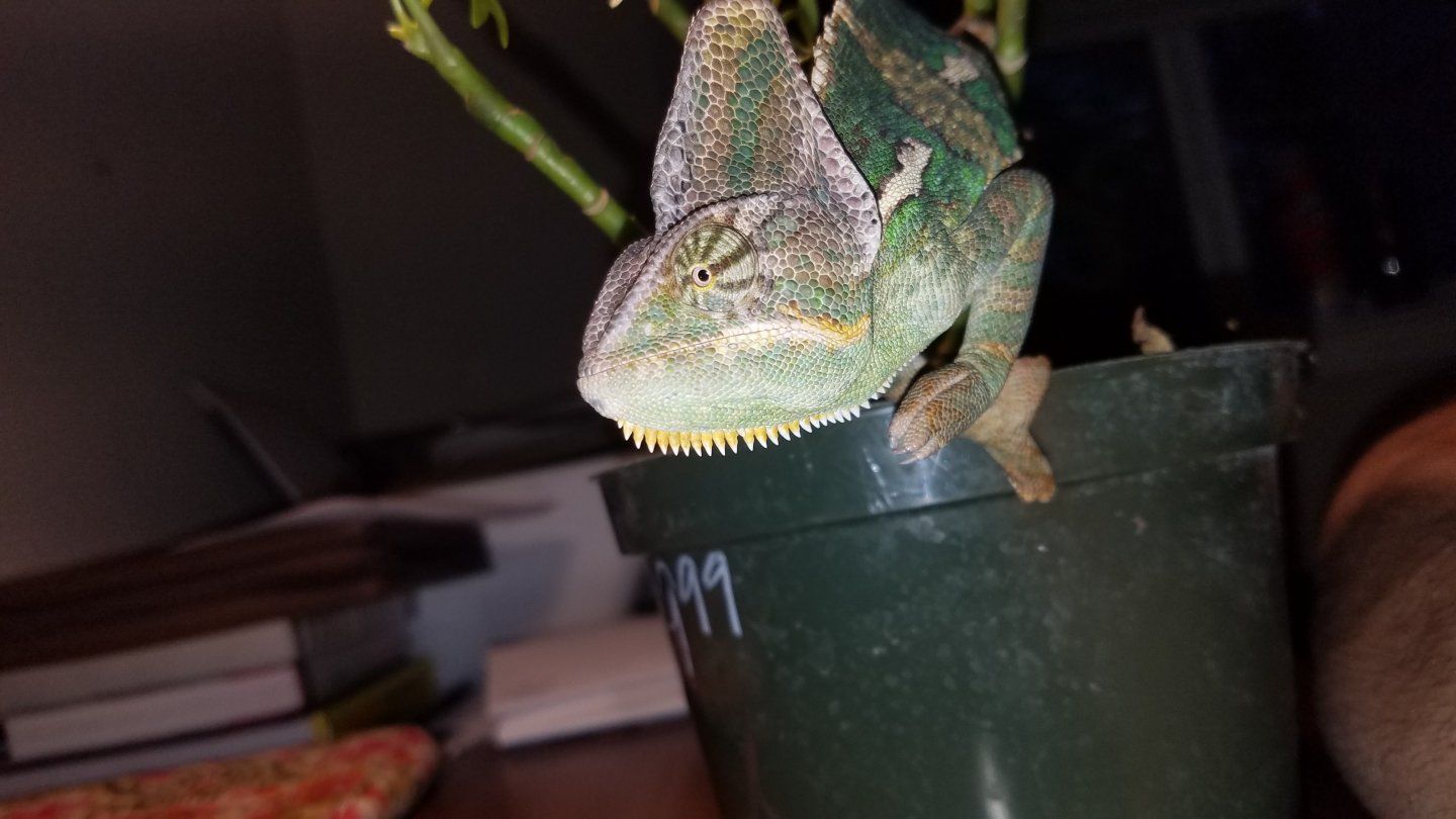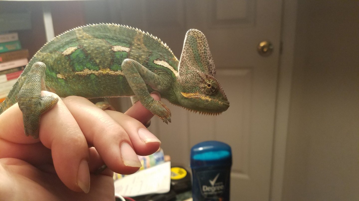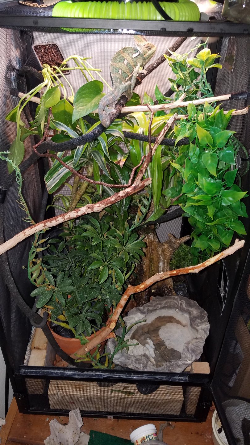 Hello This is my 6 month old baby boy veiled chameleon "Chubbs" of the newton bloodline and his enclosure. I've had him for a little over 3 months now. He has a reptibreeze screen terrarium with a mistking, reptifogger and a dripper for humidity and his water source and have an umbrella plant, pothos and Dracena plants which he loves and eats almost daily. His diet consists of crickets, blueberries, strawberries, dark green leafy greens "no spinach ofcourse" and dandelion greens and i give him mealworms, wax worms and horn worms as treats. . The crickets are "gutloaded" with a custom blend i make. He has been extremely territorial since i got him 3 months ago, but after spending alot of time hand feeding him, he has become alot friendlier and begs to come out now and climb onto my hand for the past couple week's and has a very unique personality.
