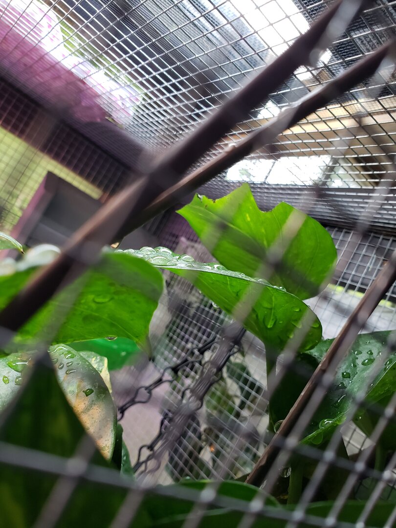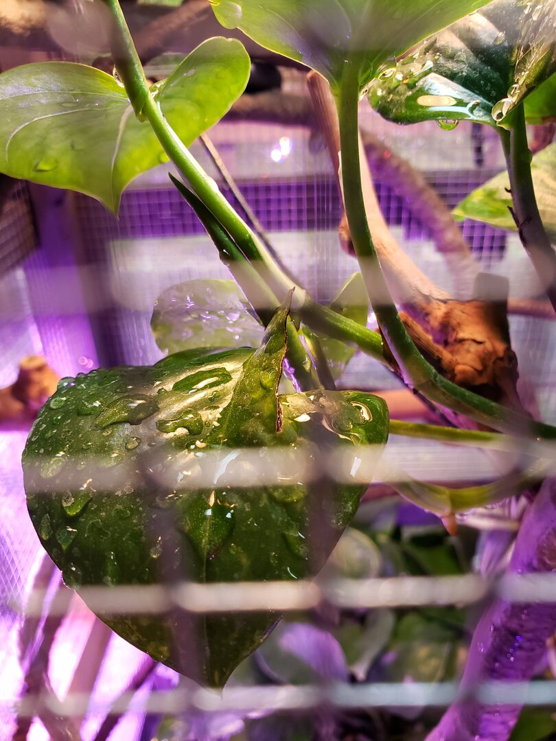 Princess Prissy Pants aka Spaz has recently started munching on her pothos leaves. She's had this particular plant in her house for about 3 months and has never bitten it before. When I noticed a couple torn leaves, I assumed she had been getting water off the leaf and some of the leaf had torn off as she was getting her water. Last night when I was turning her lights off, I noticed 3 leaves with literal bite marks taken out. Is it because I cut her back to 2 crickets every Tuesday, Thursday and Saturday and she's just hungry or are the leaves just annoying her? She's a spicy girl who bites whatever annoys her (usually it's just me she bites when I'm cleaning her house lol) I don't want to move the pothos unless I have to because it's her favorite place to sleep/hide but will if needed (it's the highest one in her house, the other plants are at different levels going all the way down to her lay bin ... she hasn't chewed on any of the other plants)