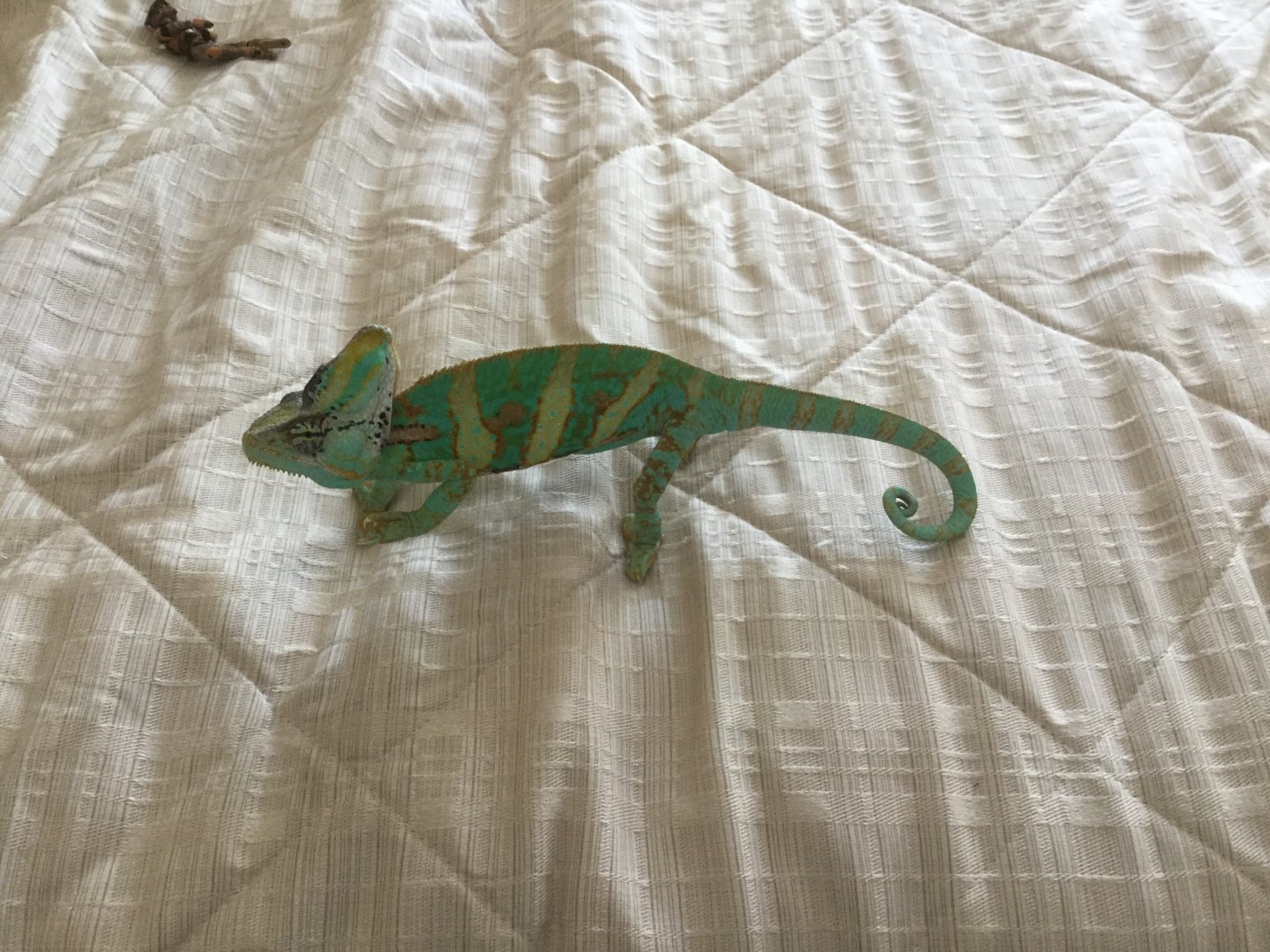 It is very important to provide a variety of size and materials of vines and branches for foot health - both to keep the nails trim but also to avoid injuries or pressure sores on the feet. This is emphasized heavily in bird keeping, but I don't think we talk about it enough for chameleons. I also believe that having a big variety of climbing opportunities both horizontal and vertical reduces the chance your cham will want to climb the screen and potentially rip out a claw.