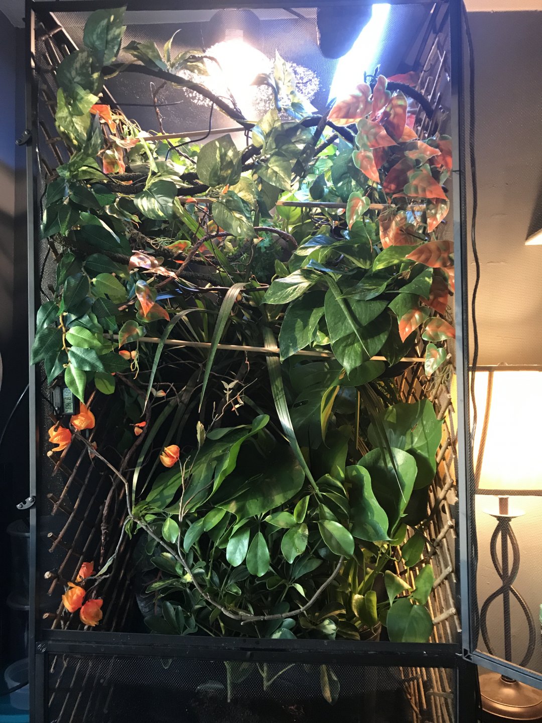 He could get lost in there, but that's a good thing! Looks awesomeThis is my set up for my vailed you can reference if you want you want to have a lot of coverage around the top this will give your chameleon a sense of security. You want to think of the branches as roadways you want him to have as many pathes to take as possible. Zip ties work well or small wire to hang from the sides I also have 6 live plants in there along with fake ones I have an Ivy hanging in the back left top corner and two pothos hanging on in the back right corner at the top and one near the front right in the middle all the rest of my plants are at the bottom dracena, split leaf plant, and a shefflara. I hope this can help you