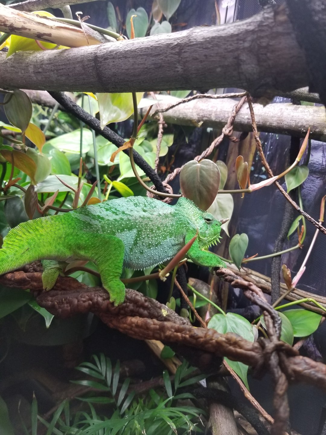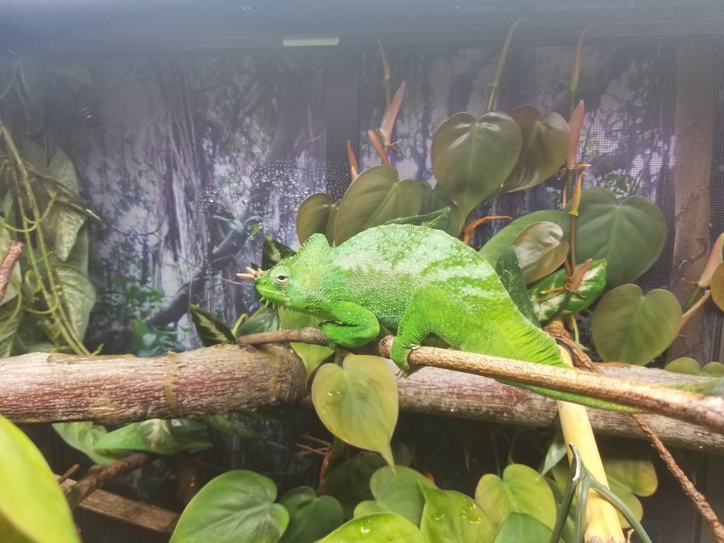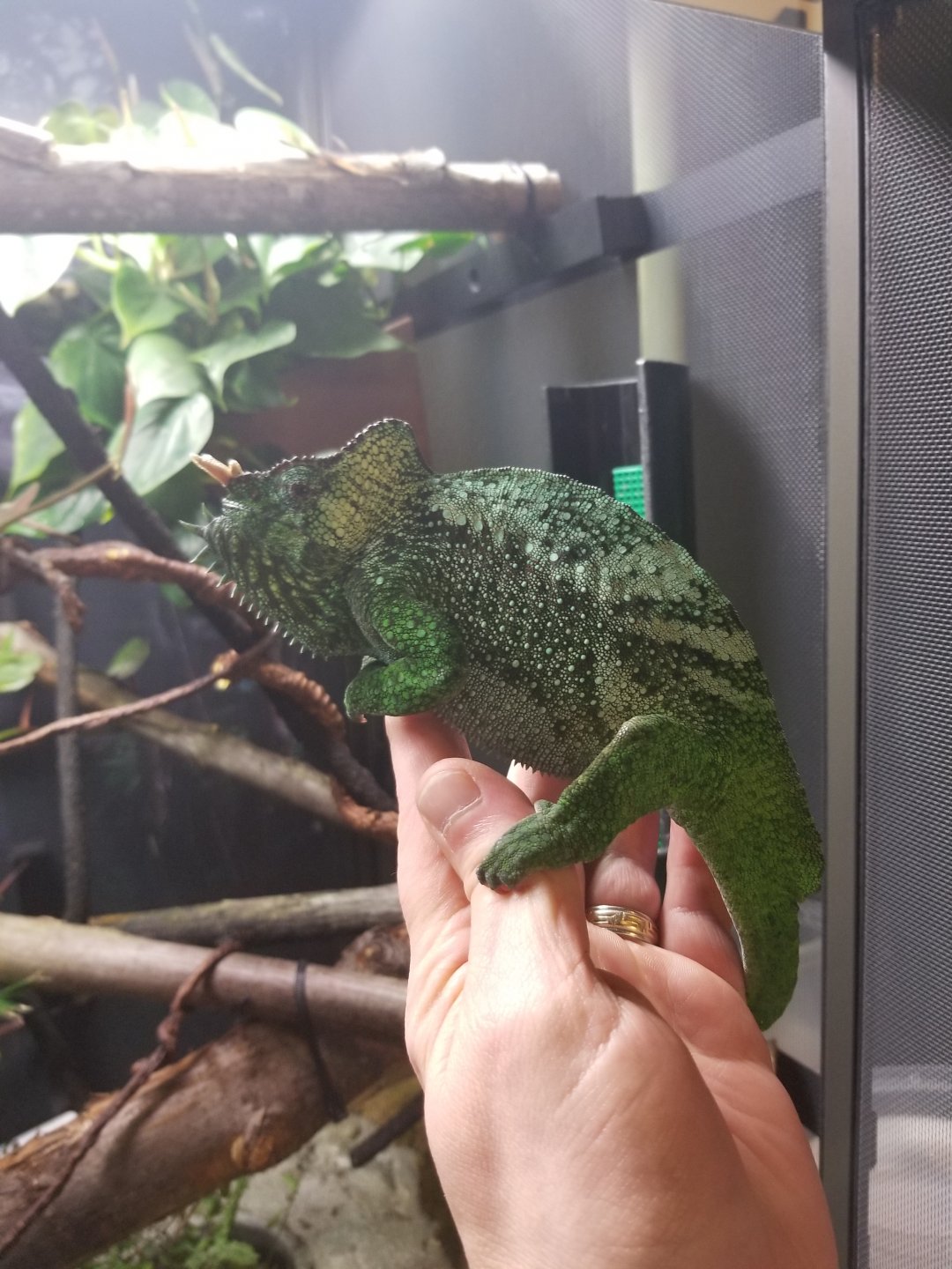 When I first brought Jameson home and a few weeks back, handling wasn’t in question. And when he did get handled during cleaning he would be a very dark dark green which I assumed to mean he was stressed and unhappy being around me. Now he’s handled probably everyday for 10ish minutes. I use a feeder to get him to crawl into my hand and he’s normally a very vibrant light green.