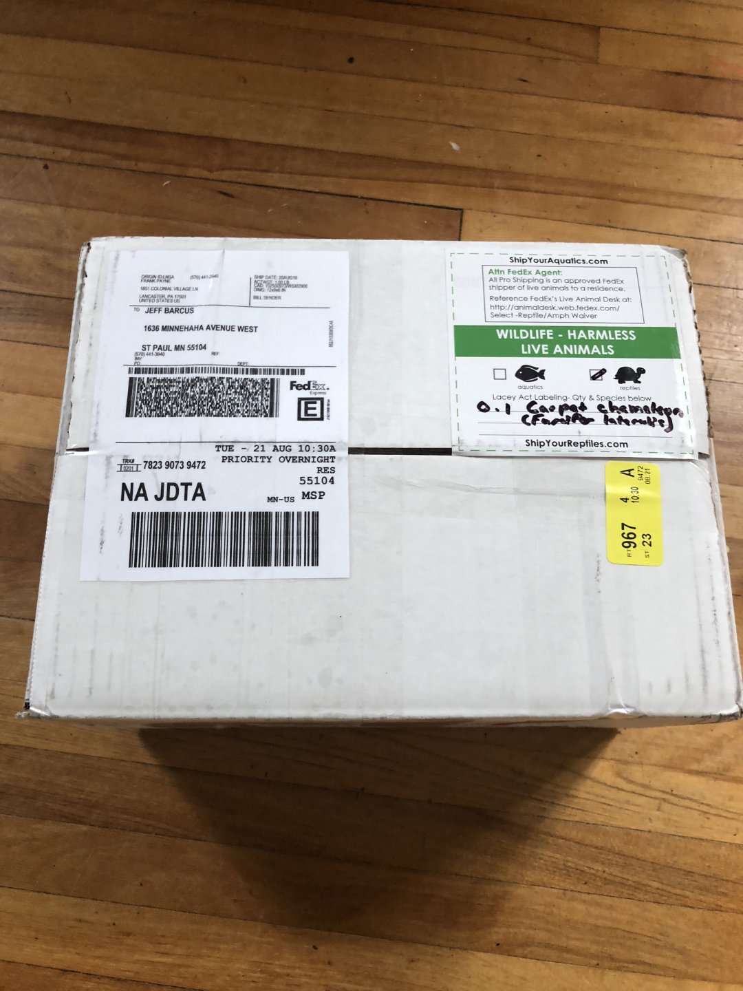 The thing about carpet chameleons is that they're a real pain to find captive bred. Frank Payne and Kevin Stanford are some of the only people who breed them and they sell fast. I'd considered risking it and getting a wild caught one, but carpets already have fairly short lifespans, so ones from the wild are usually on the late end of life (not to mention the potential for parasites, etc). So after many months of looking around, checking in with Frank Payne, getting scammed by a fake chameleon seller (we won't talk about that part...), looking around some more, and nearly giving up, I woke up last week to the post from Frank I had been waiting for for so very long. By the time I got there, there was just a single female left and we were clearly fated to be together.