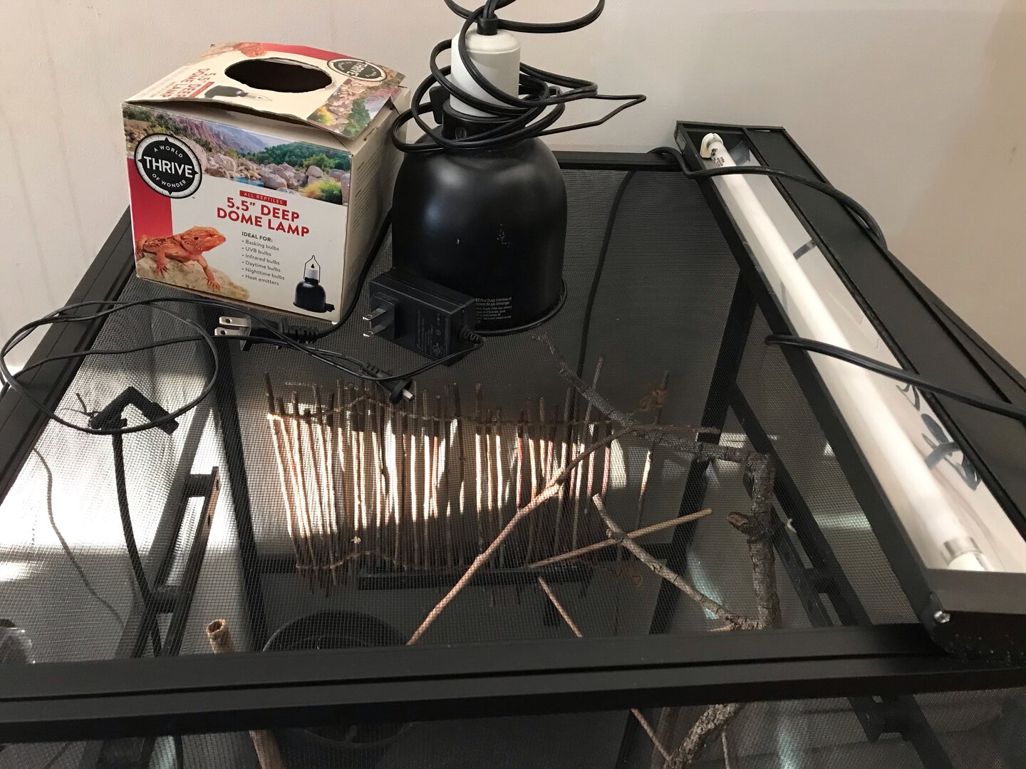not sure if this is where i should be posting so let me know if i should post somewhere else! i have a 4ft tall Reptibreeze chameleon cage with Dragon Strand support ledges on both sides and the back. one mister that holds about a week's worth of water. one heat lamp and terranium hood with bulbs included as well as two bend-a-branches and multiple sticks. i also have three pots ziptied to the ledges on the inside. the vitamin A powder i have is still good until next year, i'll add that if you want it! my chameleon sadly passed away last week and i want to give this setup to a good home. i'm asking for atleast $100 just to get some money back, it costs over $400 with everything.