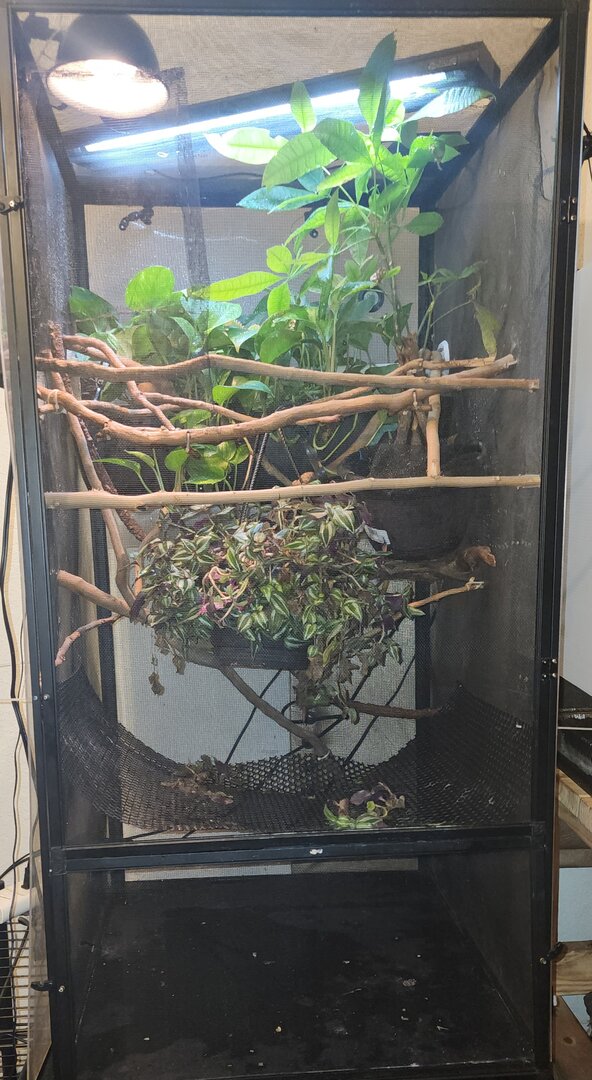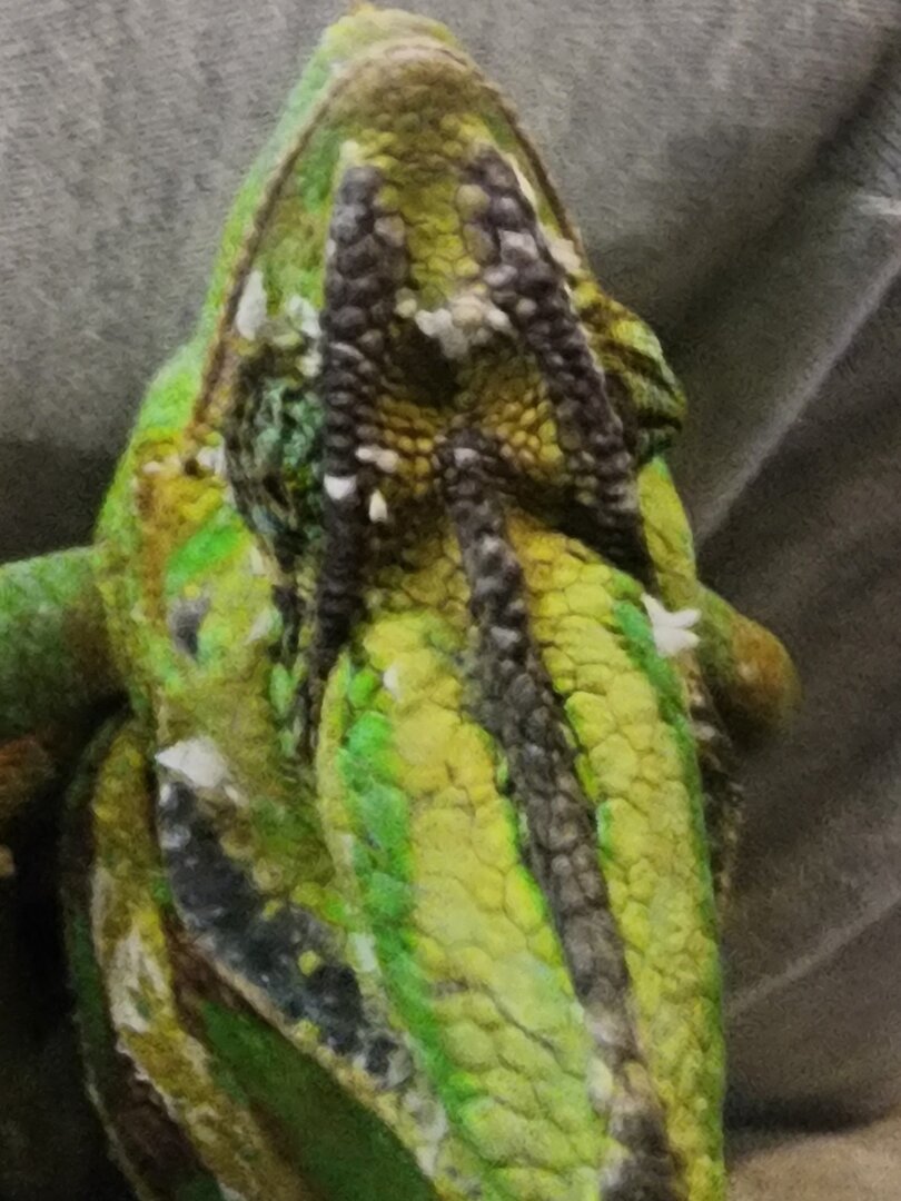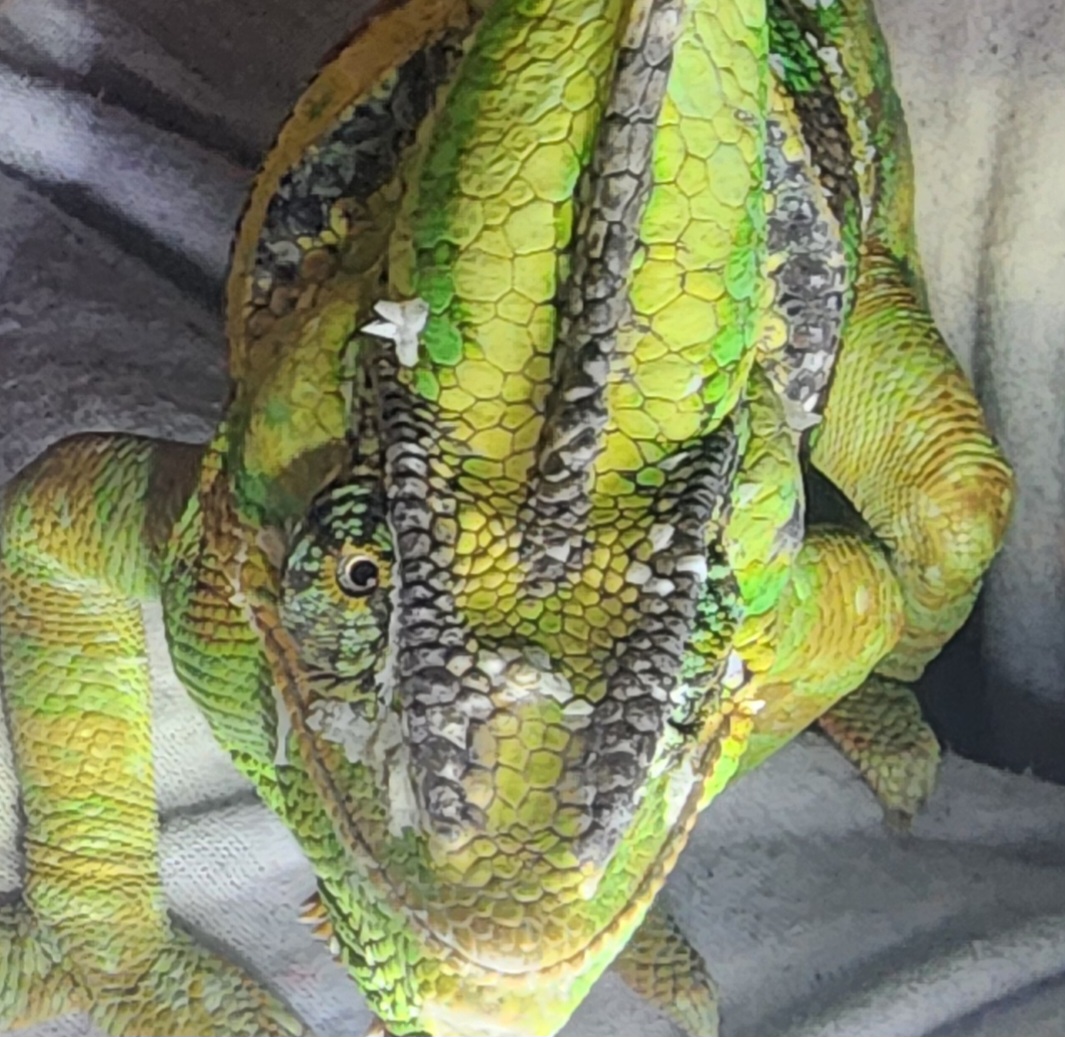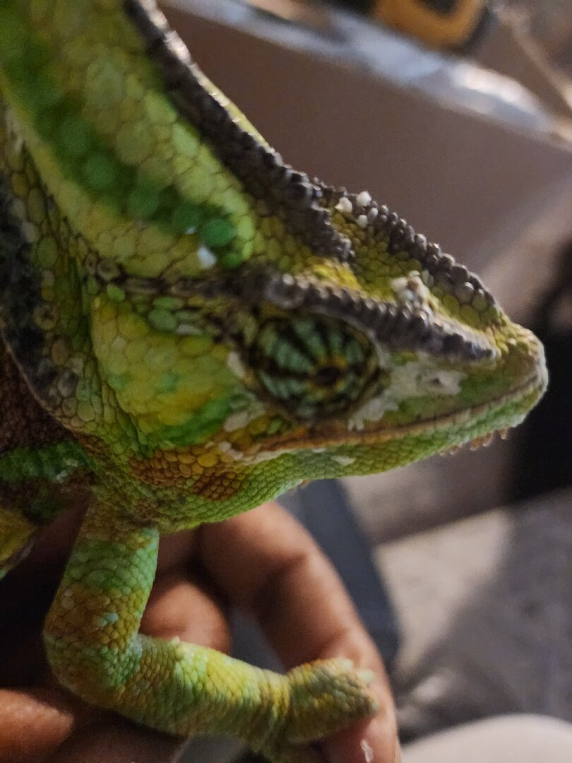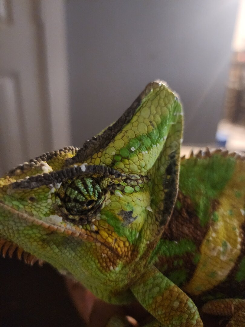 Carmelo is an adopted Cham so I have no background or age information. For the past 5 months he has been falling to the bottom of his enclosure. I removed his center plants and installed a horizontal, plastic honeycomb barrier to prevent him from falling to the floor. I took him to an Exotic Vet - blood work, fecal, and general exam was completed. Carmelo received a clean bill of health. He seems to have good grip strength but the falling and odd sleep positions continue. He falls once every 2 weeks. I just found him on the bottom most branch, hanging g on with a front claw and a back claw. The other claws were dangling. I moved him and placed him in a more comfortable position. It seems like he is in a deep sleep and so relaxed that he forgets to keep all hands on the branches. This happens several times a week. He eats well, a new uvb was installed late October. The only thing that stands out is that one eye seems slightly sunken. The other eye is normal. See pics below; Left eye seems sunken, Right eye is just fine. He just completed a full face shed. I wonder if he rubbed his eye on a branch, too hard. The eyes are not closed.