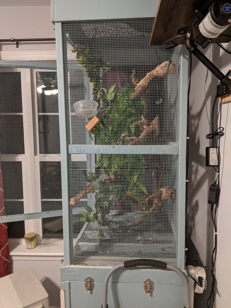 First off, it looks like a nice size cage! The fact you have nice, high branches is a great feature!