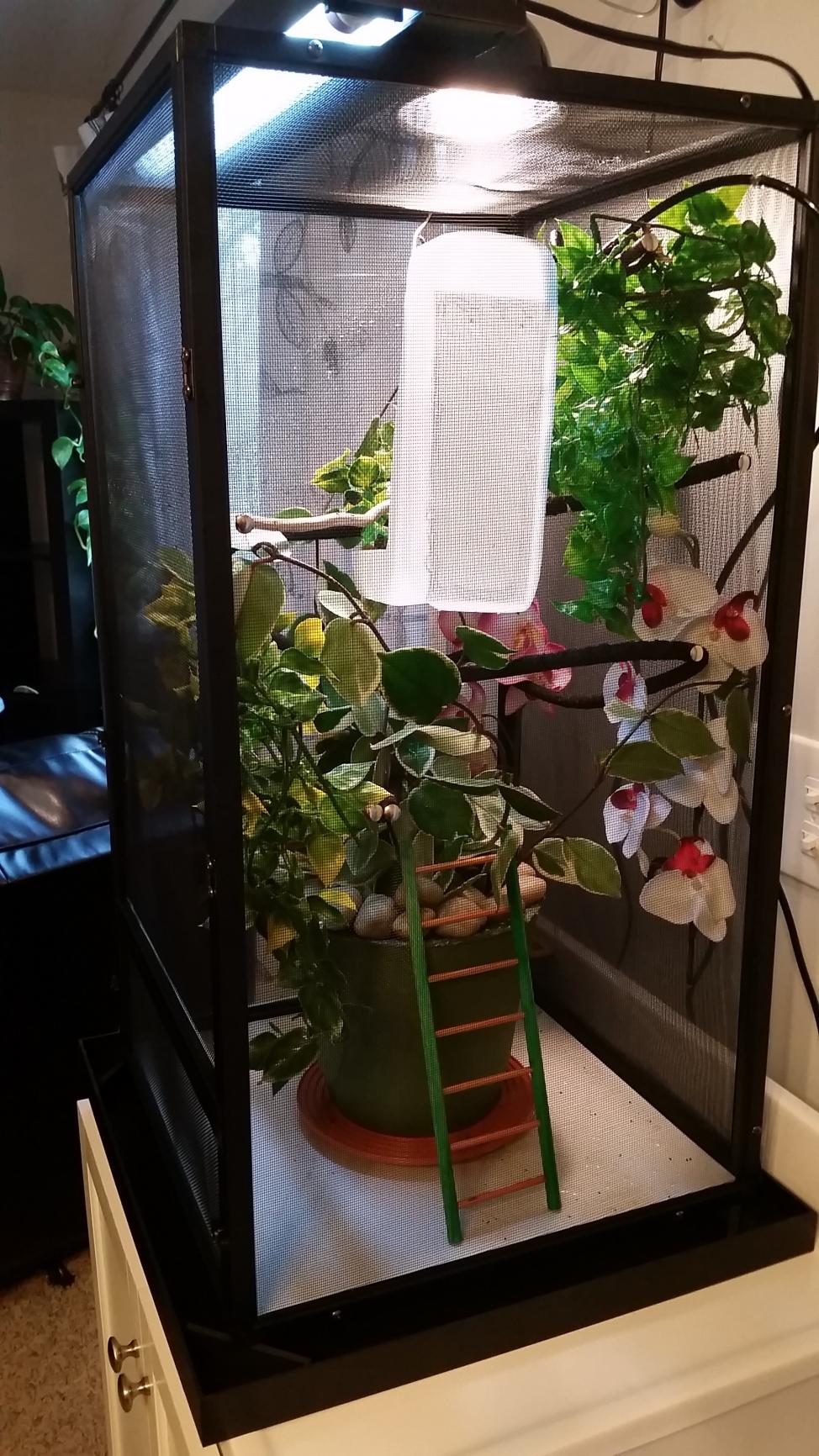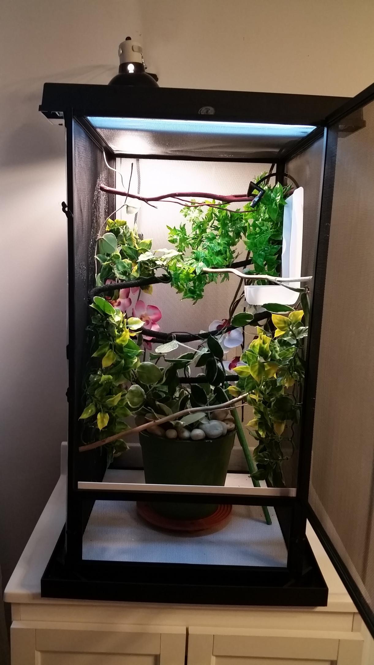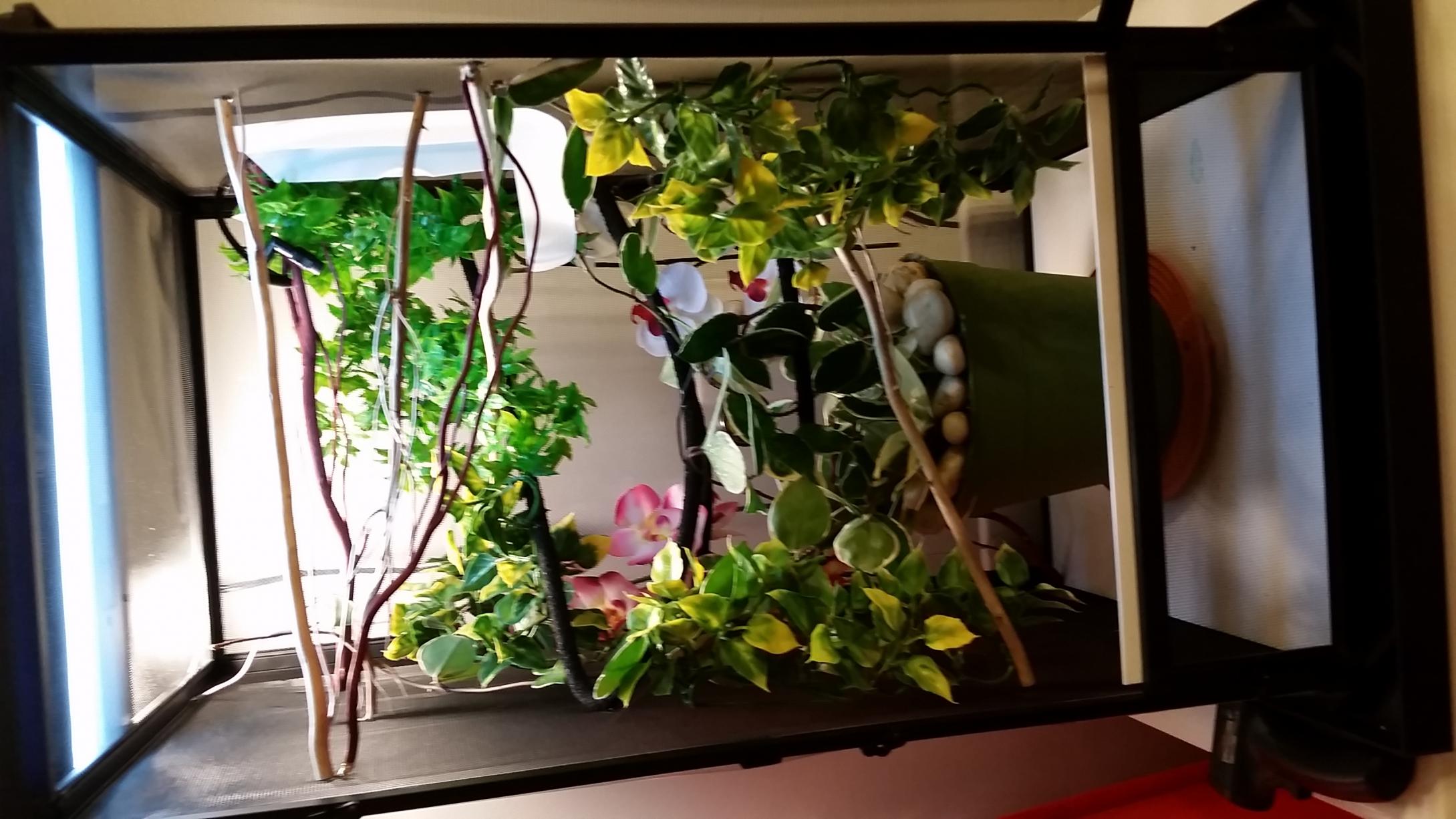 Basking temp hovers between 83-84, humidity is around 68, I'm waiting for my mister to go off again to check the humidity at that time. I have a shower curtain on the left and back side to help with humidity. I'll be misting 4x a day for 60 seconds each. Live hoya plant, the rest is fake. Reptisun 5.0 and 75 watt basking bulb. Cage is 16x16x30. Any suggestions would be greatly appreciated!
