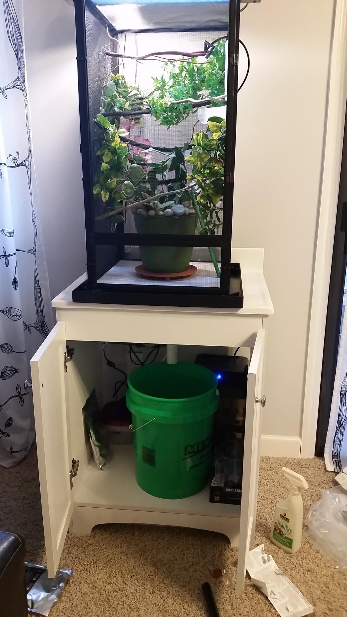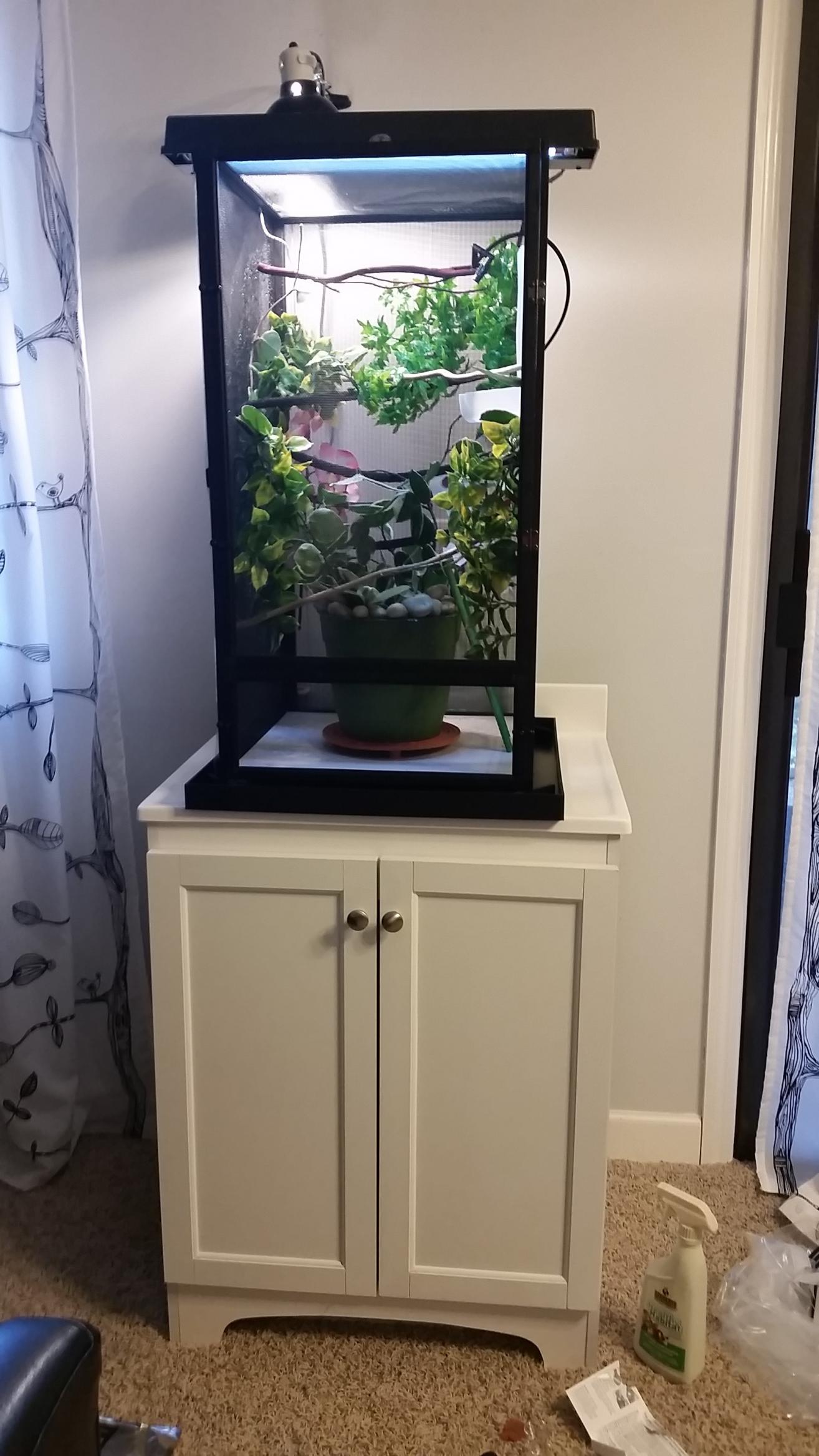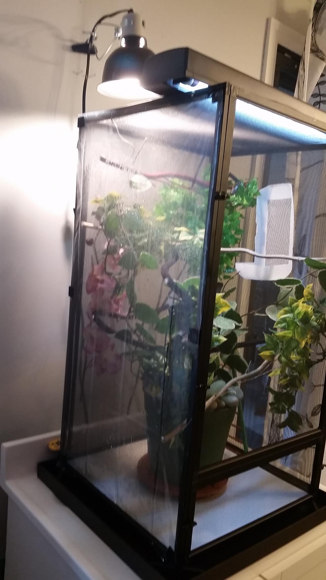 Basking temp hovers between 83-84, humidity is around 68, I'm waiting for my mister to go off again to check the humidity at that time. I have a shower curtain on the left and back side to help with humidity. I'll be misting 4x a day for 60 seconds each. Live hoya plant, the rest is fake. Reptisun 5.0 and 75 watt basking bulb. Cage is 16x16x30. Any suggestions would be greatly appreciated!