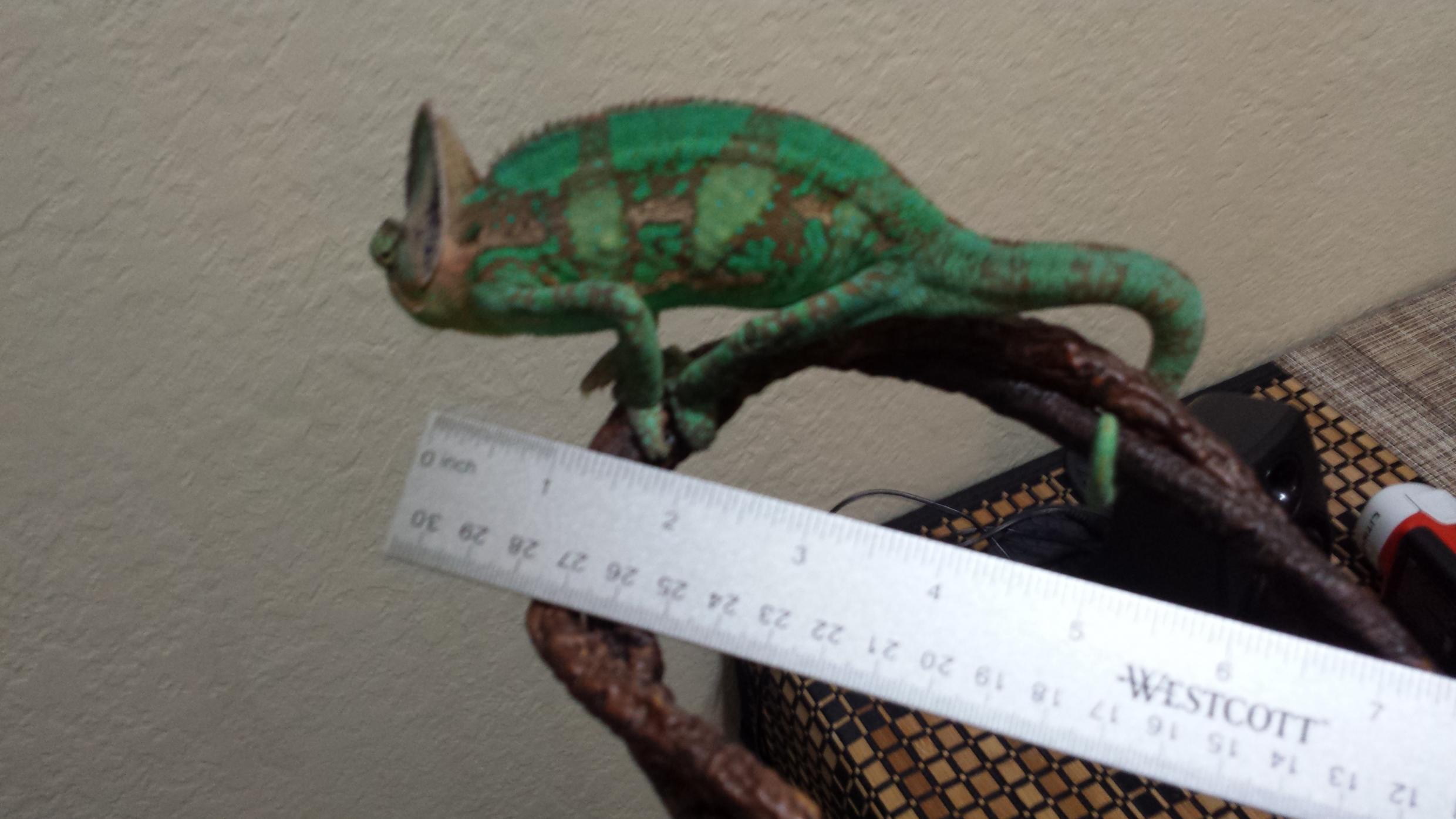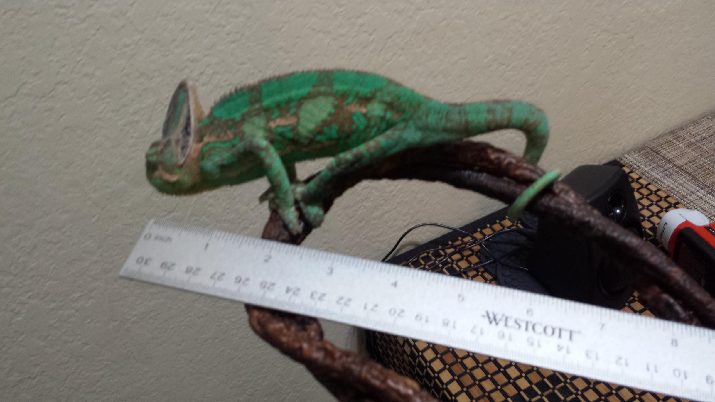 I got him a month ago he is a male veiled cham. I got him from a friend who could no longer keep him. He is my second cham. I dont actually know his exact age and neither did his previous owner. I've been trying to fatten him up a bit. He was a bit of on a hunger strike when he first came over. His previous diet was very poor and supplementation was lacking and he was ONLY supplemented with D3 enriched Calcium dust! They weren't informed so that's understandable. I also had an incident of him running lose for a couple days.