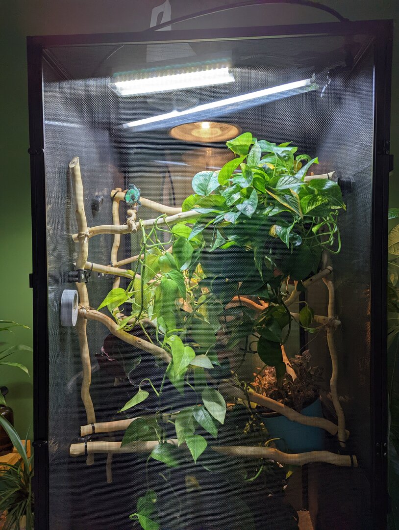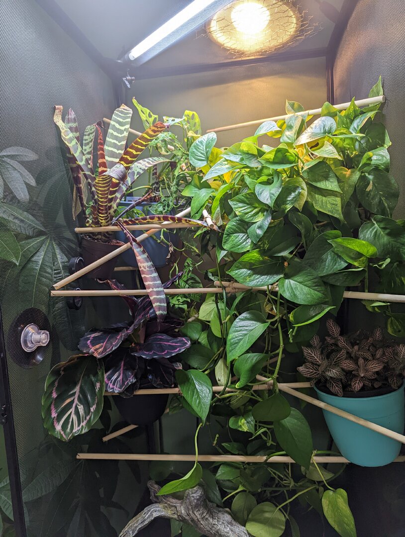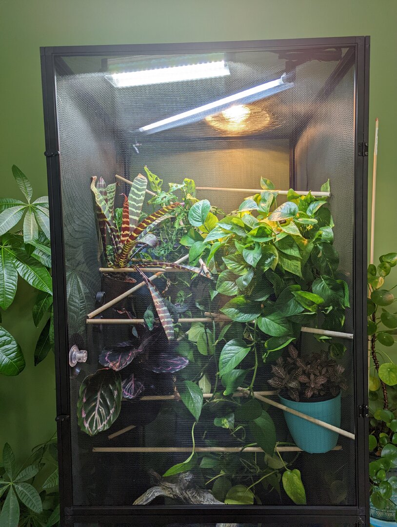 Overnight – Upwards of 96% humidity after misting. I have seen it drop to 78% once when I awoke in the middle of the night from the sensor. - Plants – Mainly Potos are spread throughout the cage. I have also included a nerve plant, a bromeliad, a calathea dottie, and swiss cheese plant.
