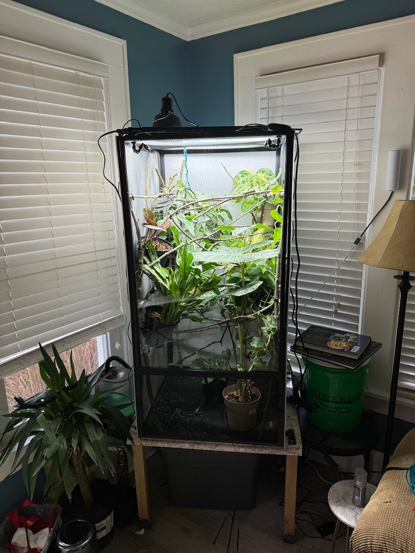 I plan on adding details of all the things I did differently, but starting out this thread I want to start with where I'm at in the new enclosure. This is a reptibreeze hybrid conversion. The thing I'm MOST pumped for is the acrylic door that the screen was removed from and piece of acrylic was put in its place. The was one of my least fav things with the conversion, the window film made it ugly from the outside and just not appealing. Secondly I no longer have permanent bamboo poles throughout AND I have proper drainage setup!