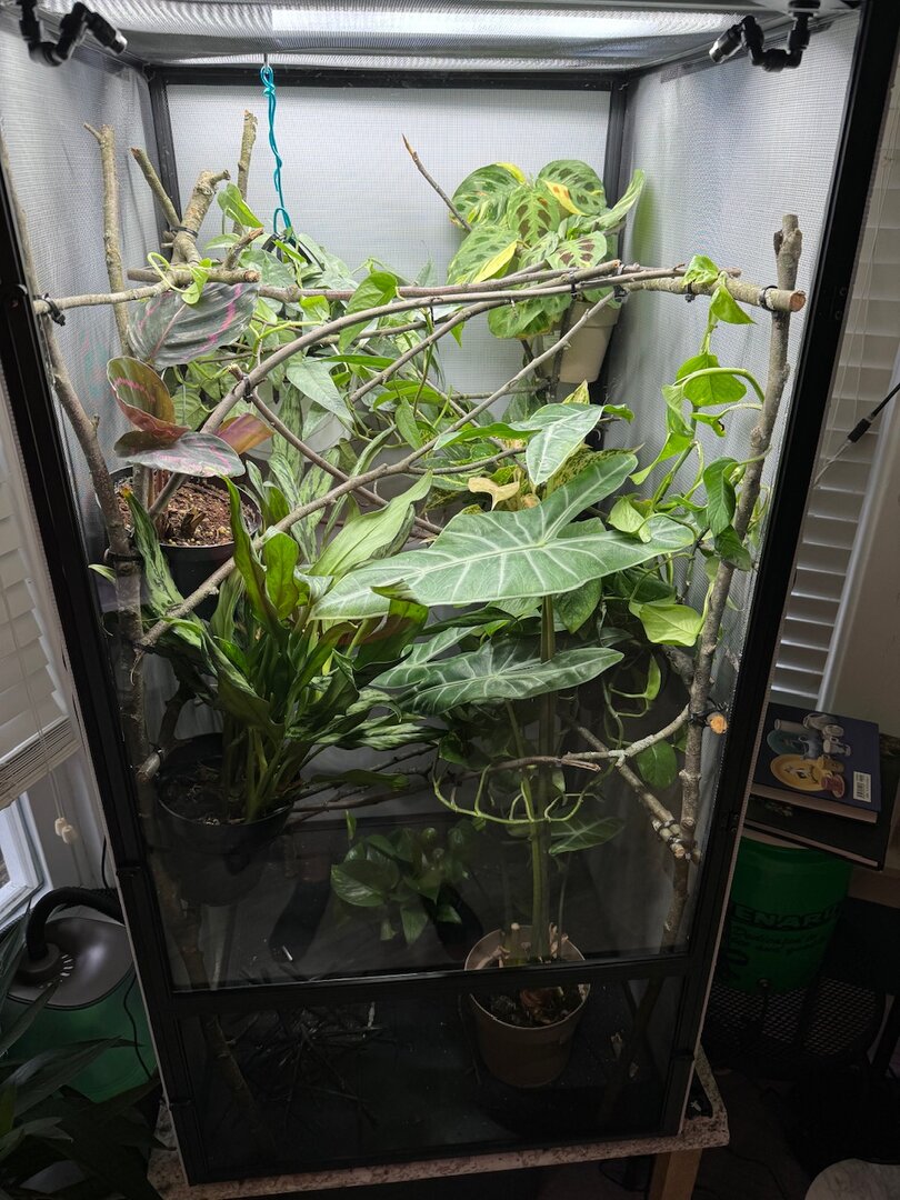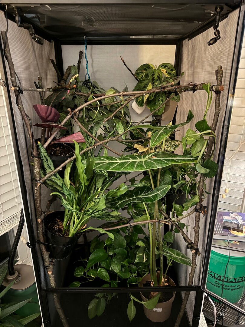I want more plants but not sure how to do it without not be able to move in there and making sure all the plants get the right light, the plants will grow in over time, I've also tested UVI and heat / misting etc