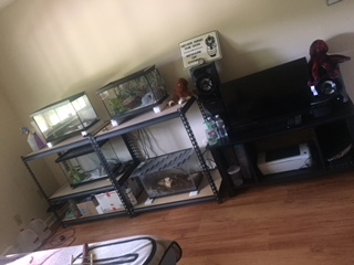 So far, I have a medium repti-breeze screen tank, big dripper + the exo terra dripper plant; a string of fake vines, flexible climber vines & flexible "jungle tree" - keeping the humidity around 50-60%... the ambient temperature in that room is anywhere between 70-80 degrees without the heat on just due to the 6 other reptiles we keep, and his basking spot is usually around 85.