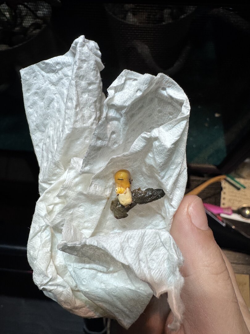 Hi! Was cleaning up Rangos enclosure and noticed a recent poop with some orange to it. I just want to make sure it’s a dehydrated poop. My dropper broke the other day so I’ve been doing an alternative method. And when he shows signs of looking for water I spray a bit to drip off a leaf.
