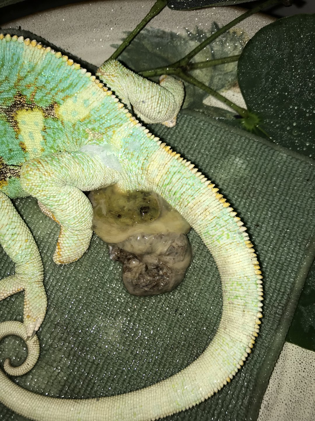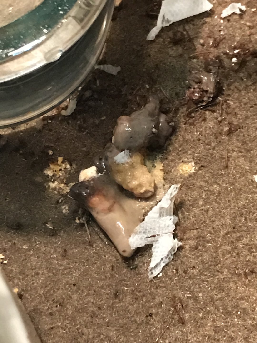 Thursday morning (today) I offered water which he accepted in the morning but he was very lethargic and refused to allow me to give him water for the rest of the day. I purchased wax worms with the intention of grinding them up but was unable to get him to allow me to open his mouth. This evening, assuming we were still dealing with dehydration, I put him in the warm shower, out of the stream, for a good 20 minutes to steam and hydrate. As soon as I turned the water off, he made a great effort and had a massive bowel movement (think 2-3x size of normal) which was runny but not Yellow,orange, or translucent).