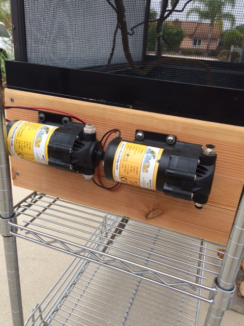 The watering system is designed with two different timers for (some) fault protection. One controls the misting system and can be programmed to come on several times per day and the second timer refills the drip system to provide fresh water once a day. The whole watering system is designed to only need to be filled once a week, but could be tweaked for more or less time between refills.