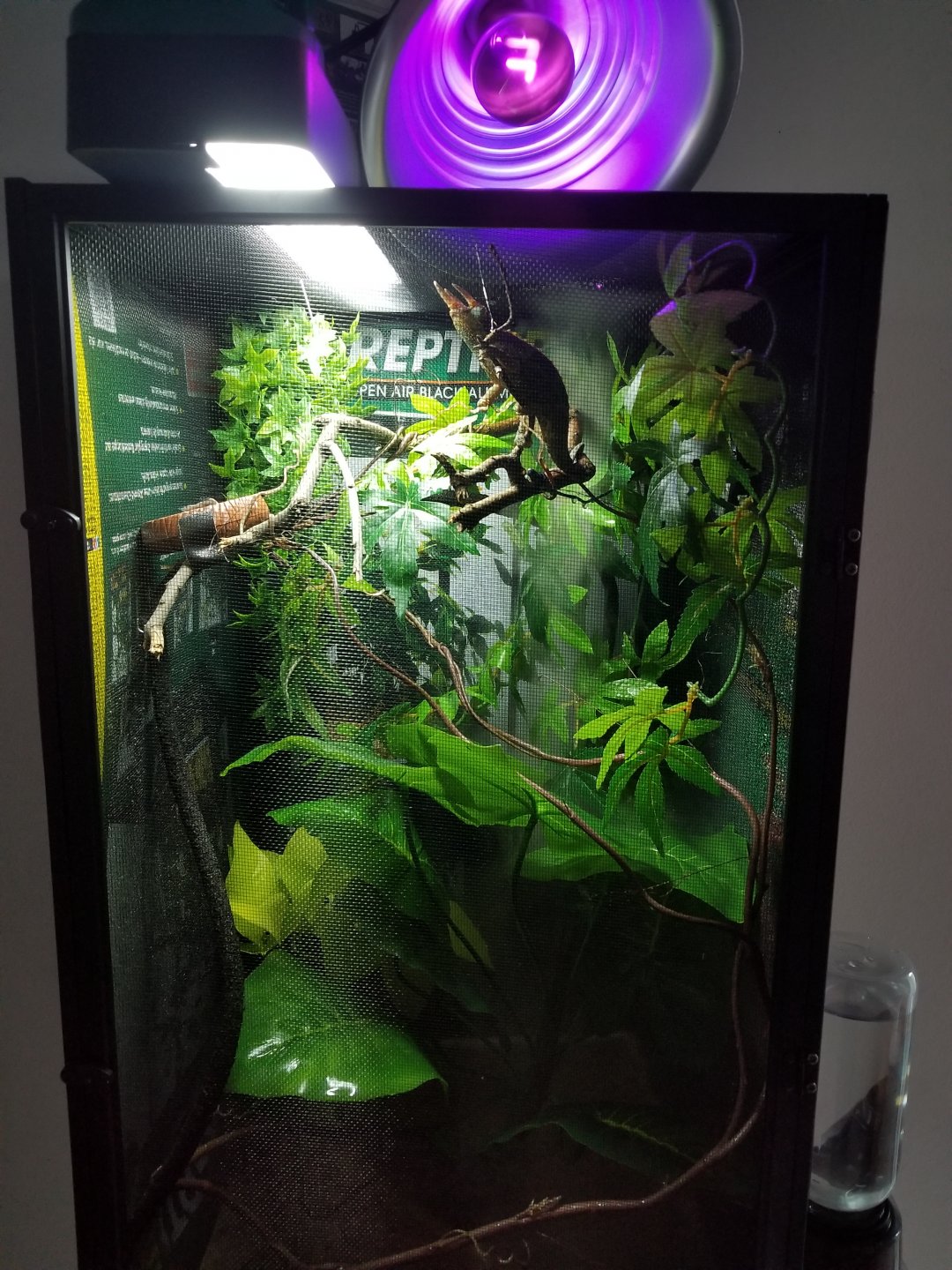 Hey folks. I'm getting ready to build an enclosure for my Jackson's and had a couple questions. I currently have a reptibreeze e Cham setup, 18*18*36 metal screen. I have a challenge keeping the humidity up. Because of this I want to build a custom enclosure. I was going to do 20" deep, 36" wide and 42" tall. Heres where my debate lies. I'm going to do a solid glass back and the other three sides will be half glass and half screen. First question is that I was wondering if I should put the glass up top to catch the misting droplets or keep it low to hold the fog in till it billows over the top.