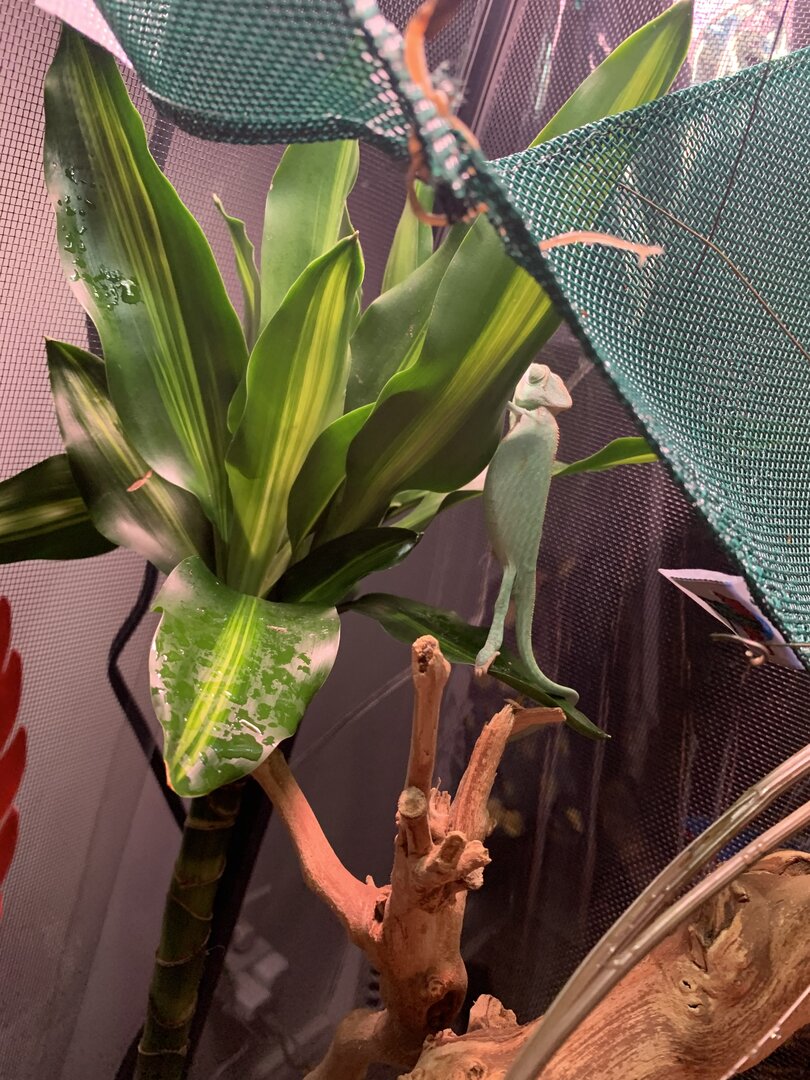 But it was no mistake, as we always take full responsibility for our actions and when we bring in a new baby will do 150% what we can to do what we need to do to give them the life they deserve. We have been looking up and learning and giving this our best for the last two weeks. We have dogs and a snake and have had a frog in the past, but had no idea what Chams need and what to expect. Our $50 little green lizard is officially a $5000 (exaggerating slightly after food and cages and supplies and you name it) juvenile male veiled chameleon.